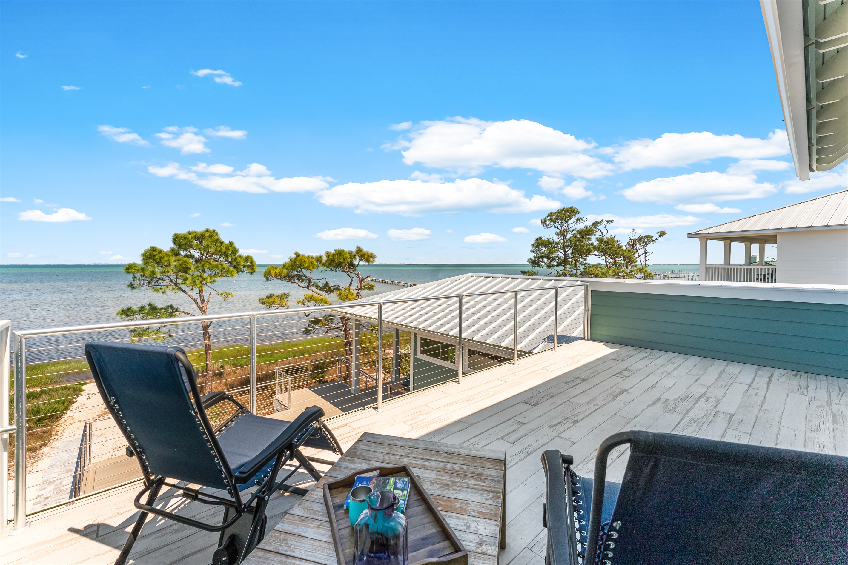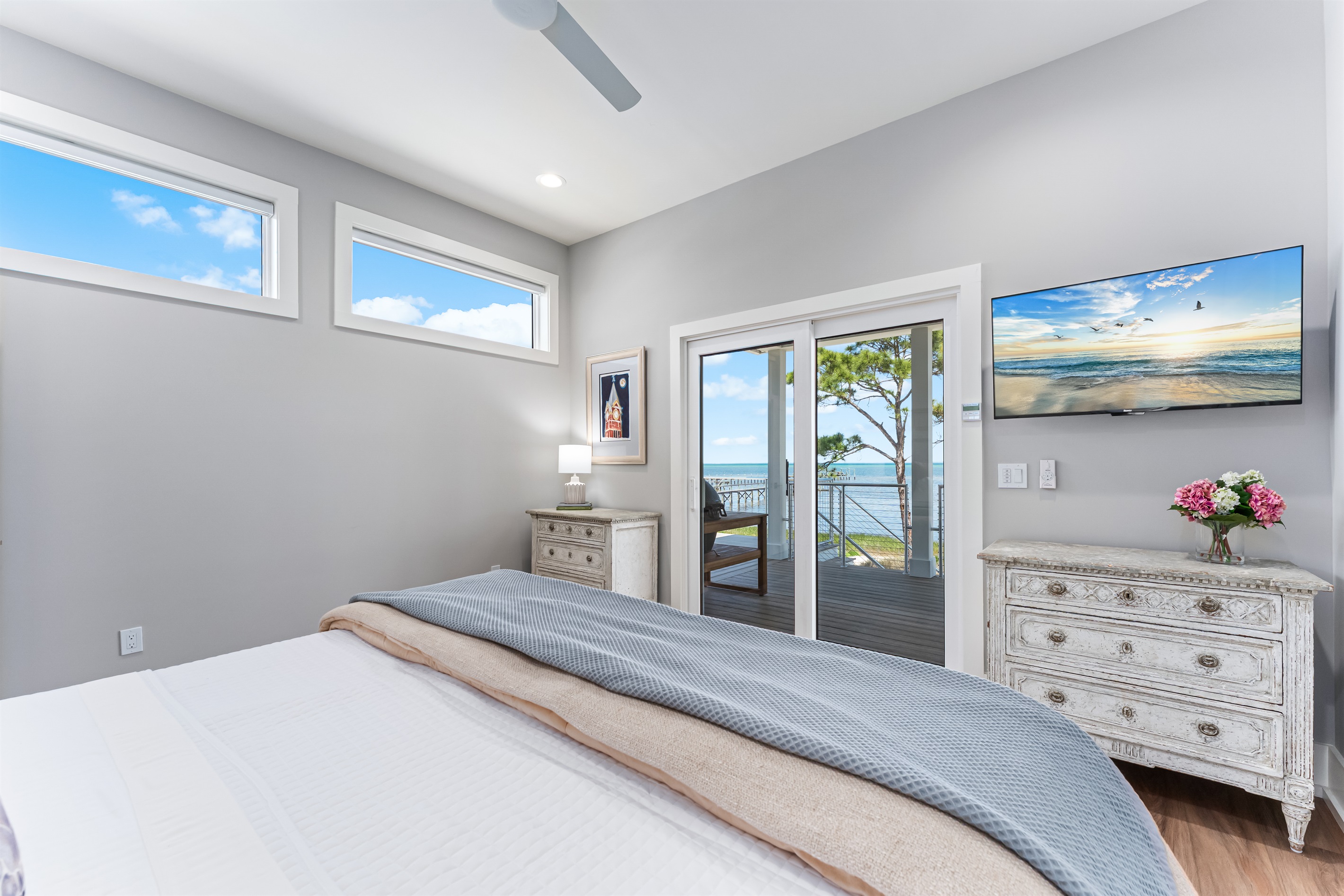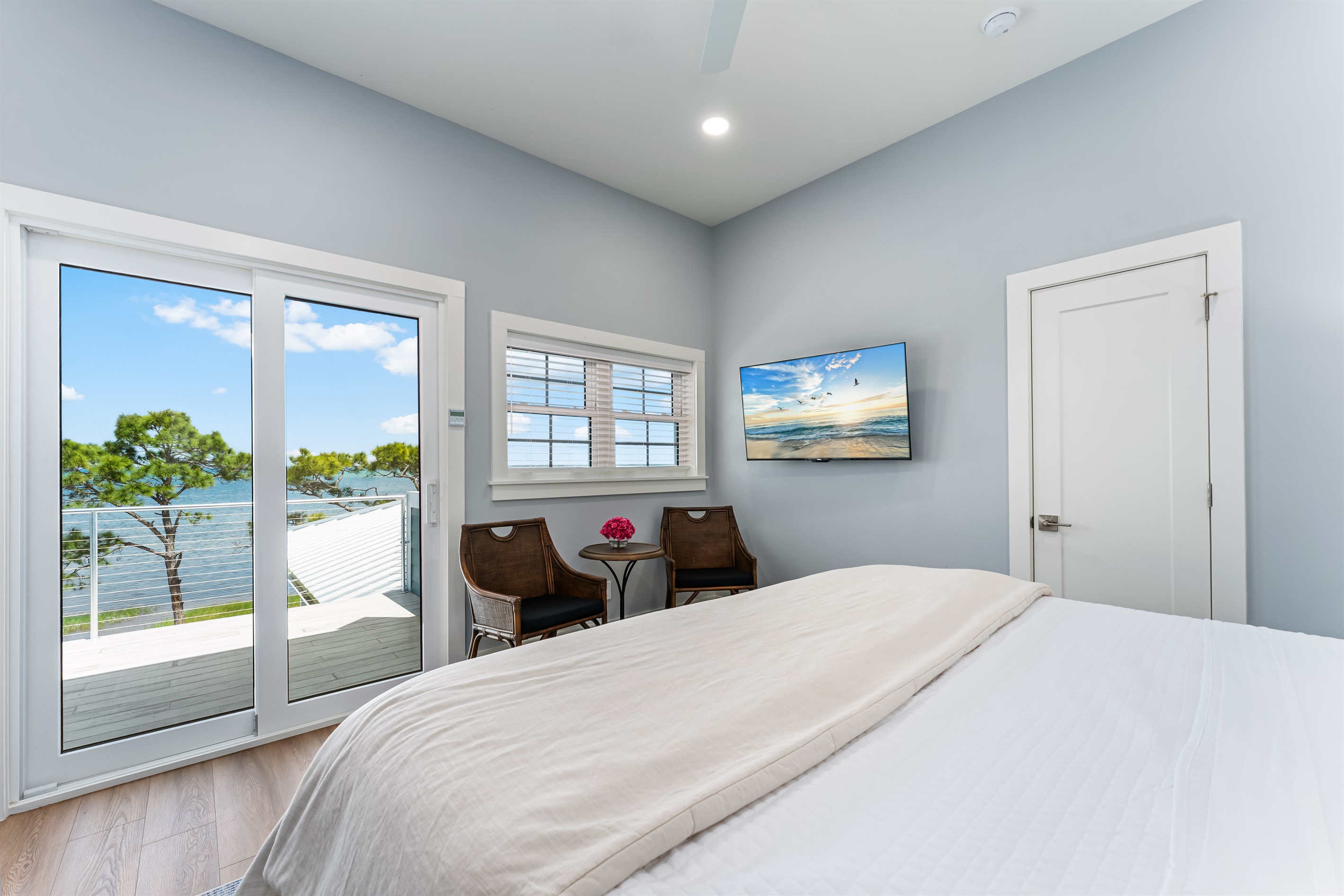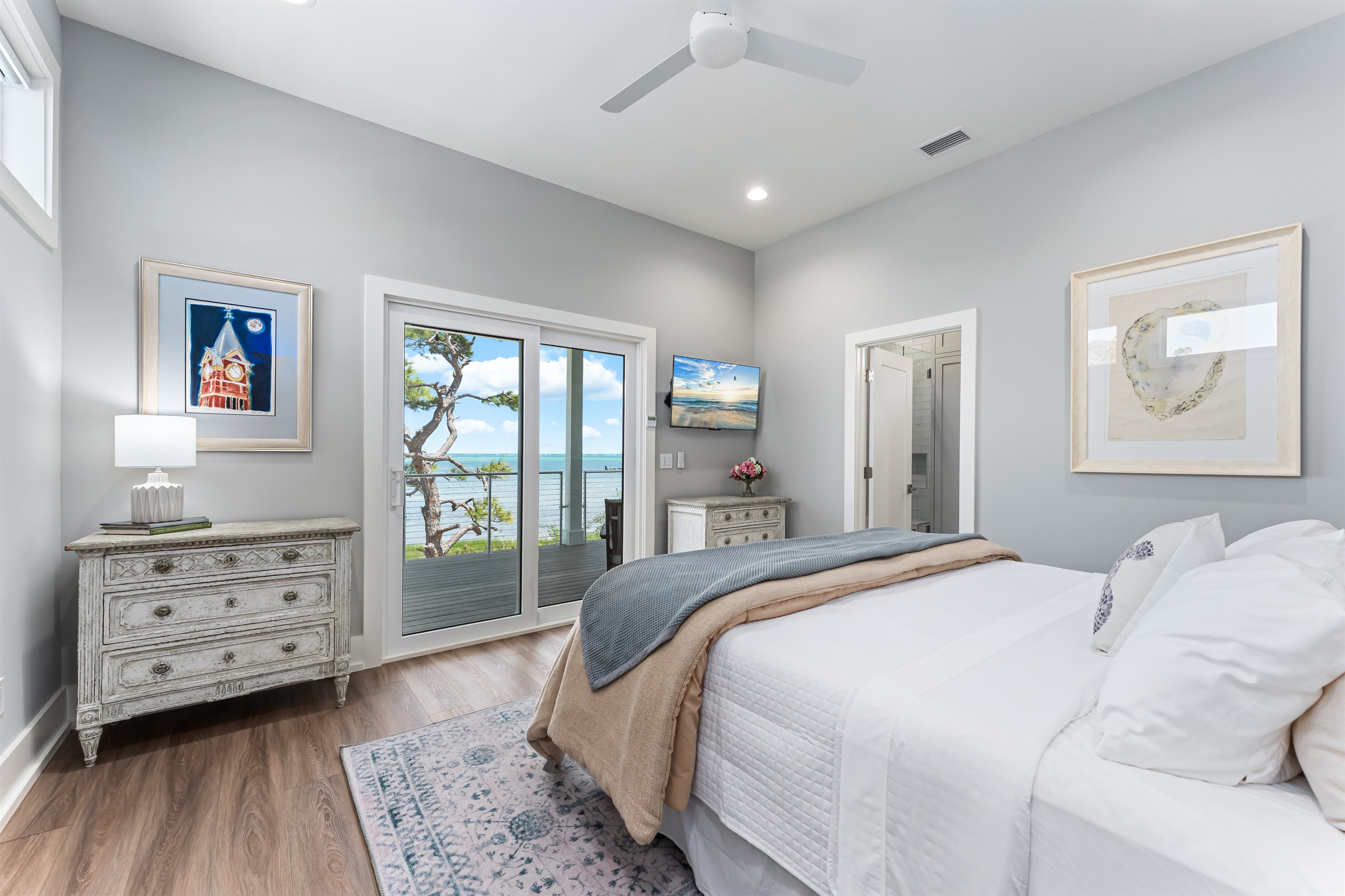Also on the main floor, guests can easily retire to the 3 spacious bedrooms: a lovely primary with a king bed, private bathroom, and deck access, alongside 2 versatile guest bedrooms, each with a private bathroom and a king bed that converts into 2 extra-large twin beds is perfect for families! Step outside to the expansive second-floor deck, where a covered sitting area with plush furniture and a TV invites relaxation.