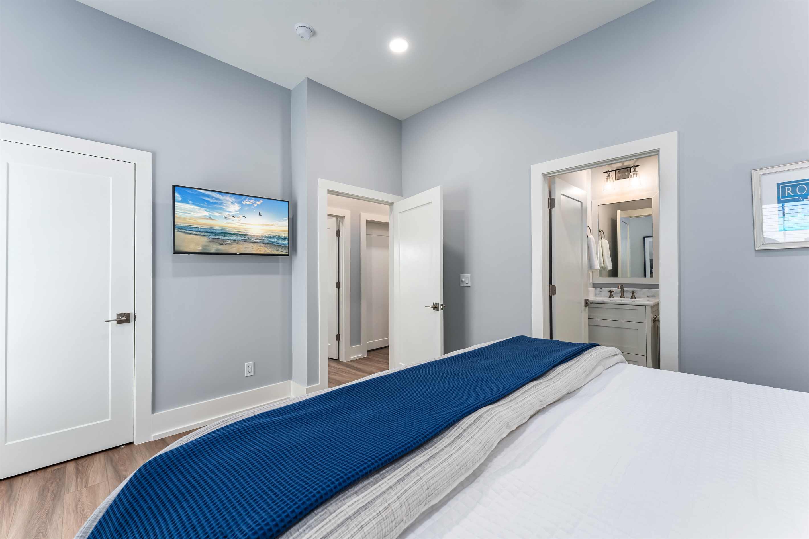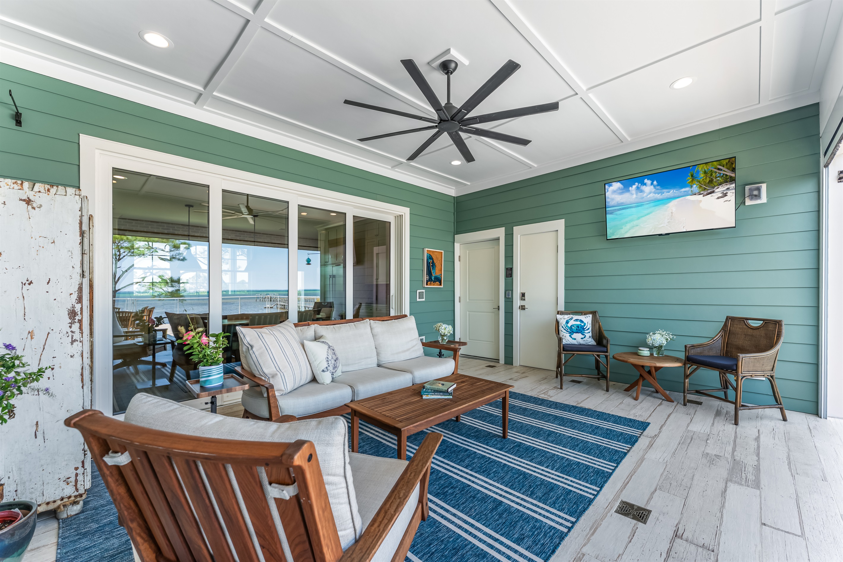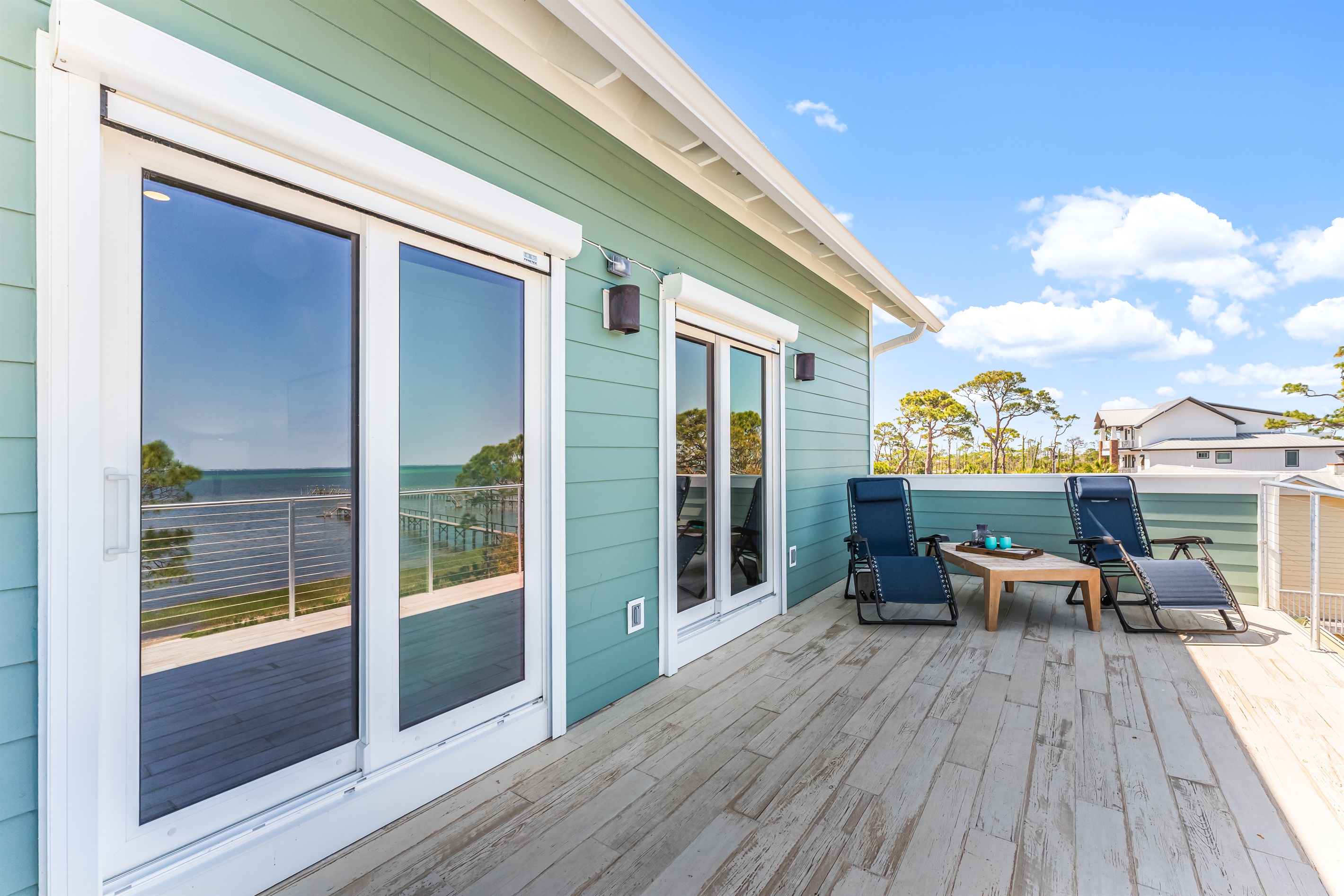 Also on the main floor, guests can easily retire to the 3 spacious bedrooms: a lovely primary with a king bed, private bathroom, and deck access, alongside 2 versatile guest bedrooms, each with a private bathroom and a king bed that converts into 2 extra-large twin beds is perfect for families! Step outside to the expansive second-floor deck, where a covered sitting area with plush furniture and a TV invites relaxation.