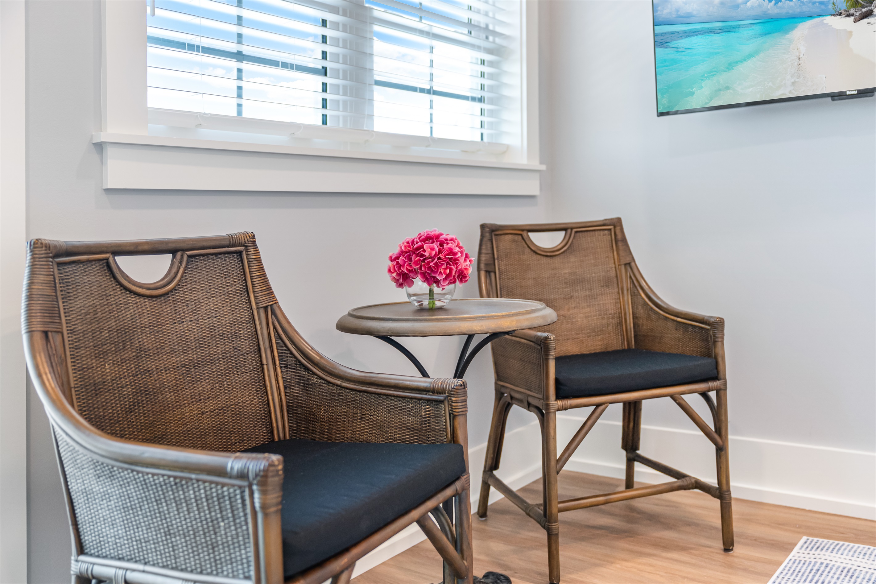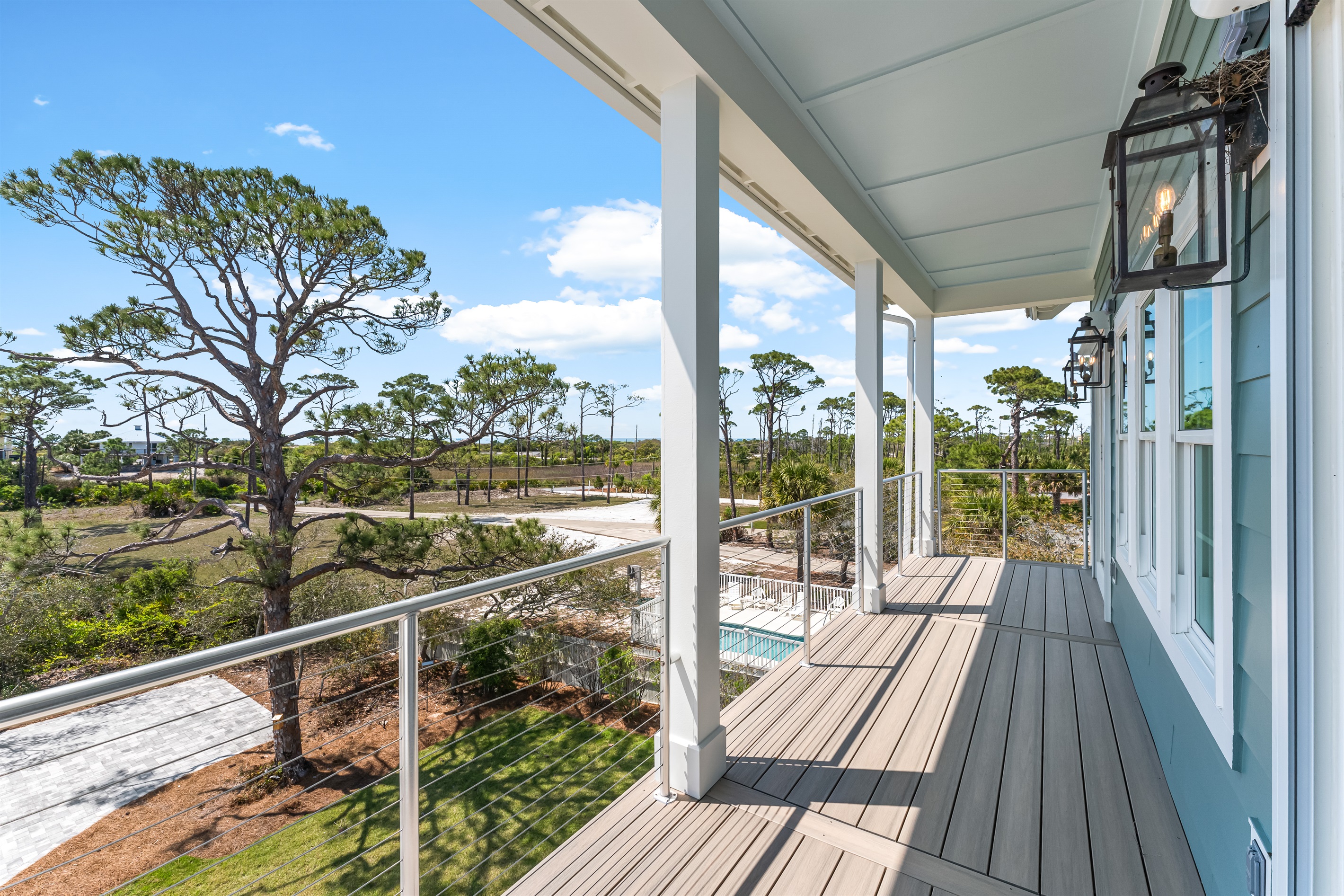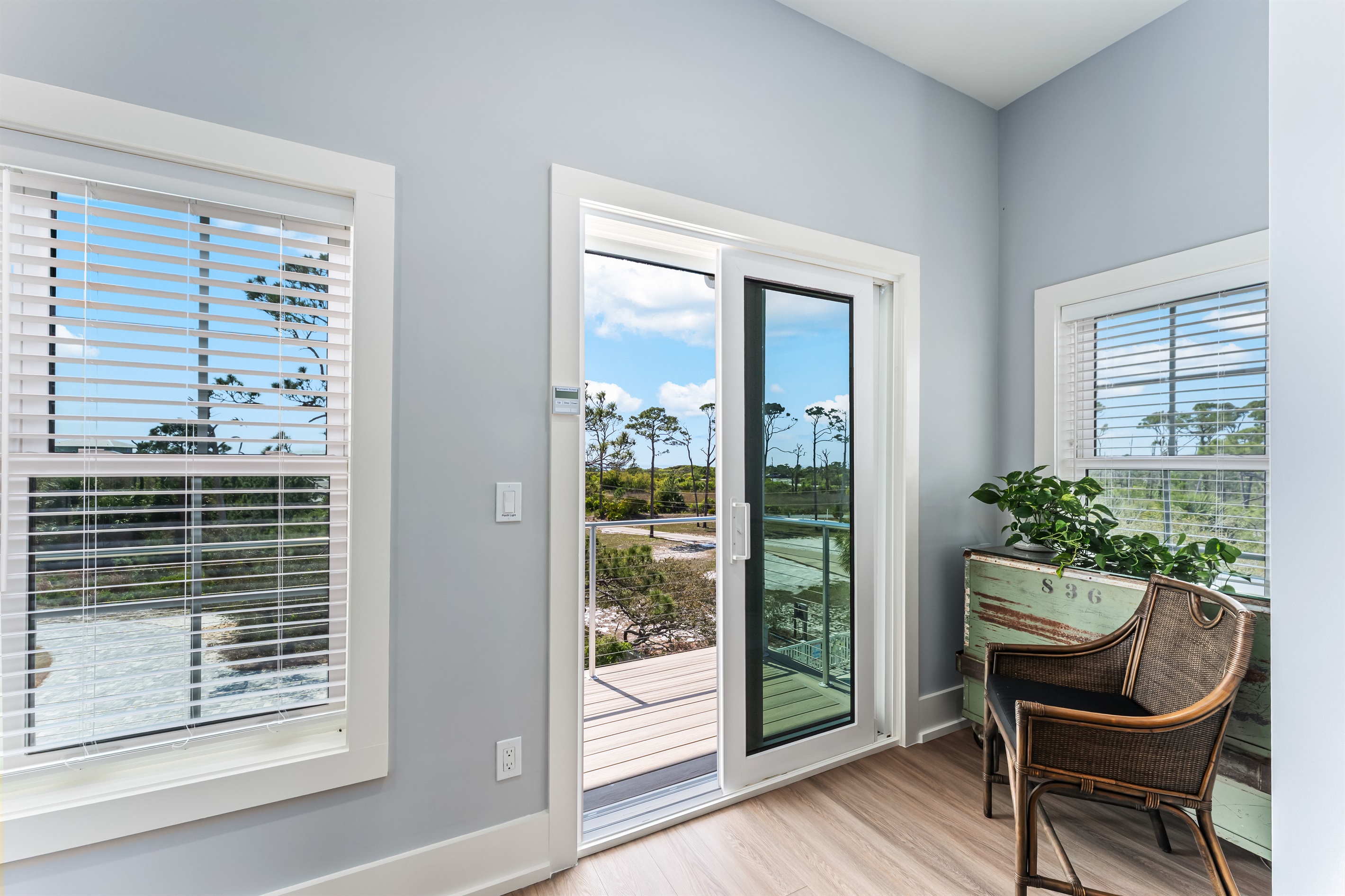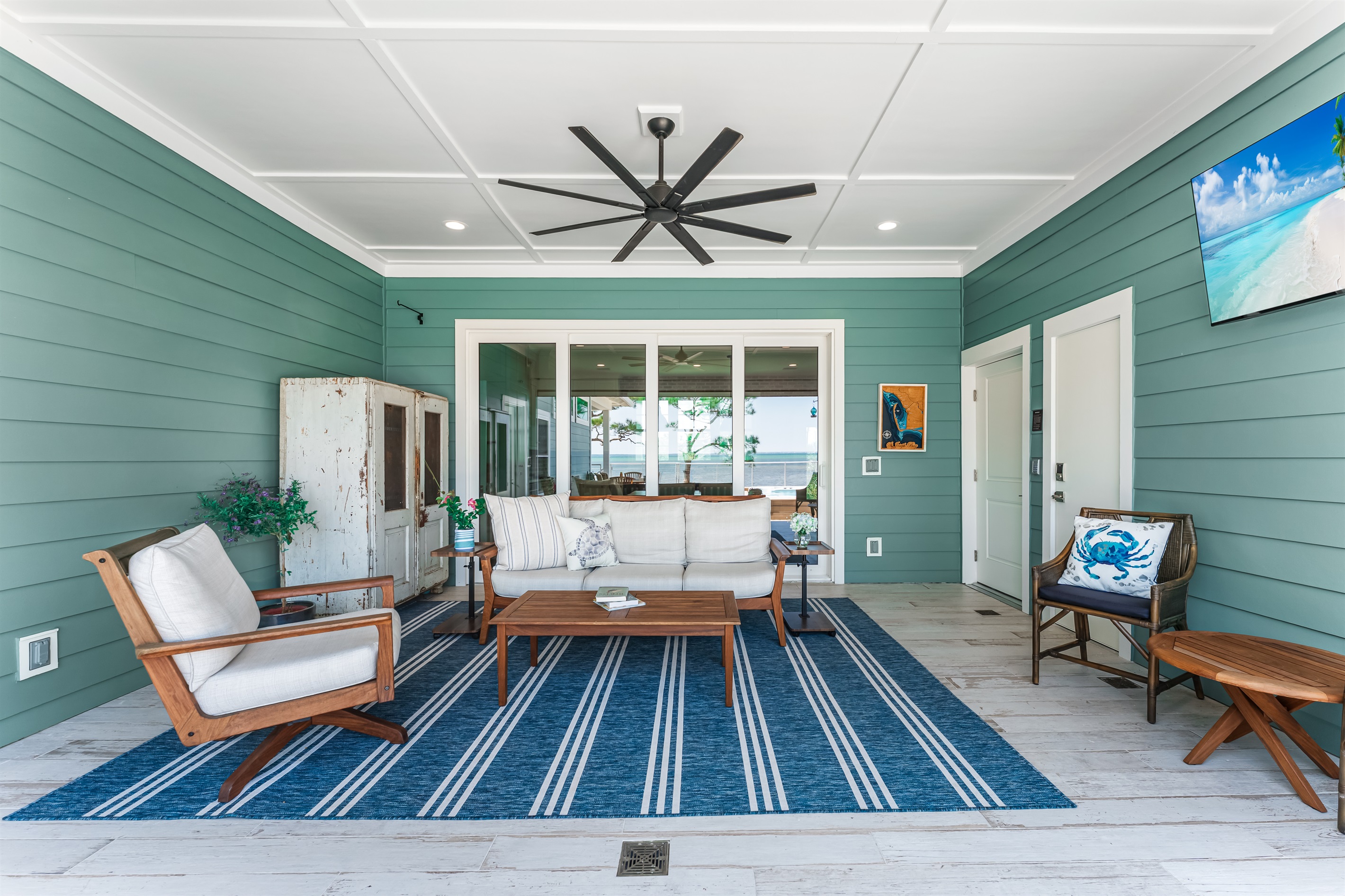 Also on the main floor, guests can easily retire to the 3 spacious bedrooms: a lovely primary with a king bed, private bathroom, and deck access, alongside 2 versatile guest bedrooms, each with a private bathroom and a king bed that converts into 2 extra-large twin beds is perfect for families! Step outside to the expansive second-floor deck, where a covered sitting area with plush furniture and a TV invites relaxation.