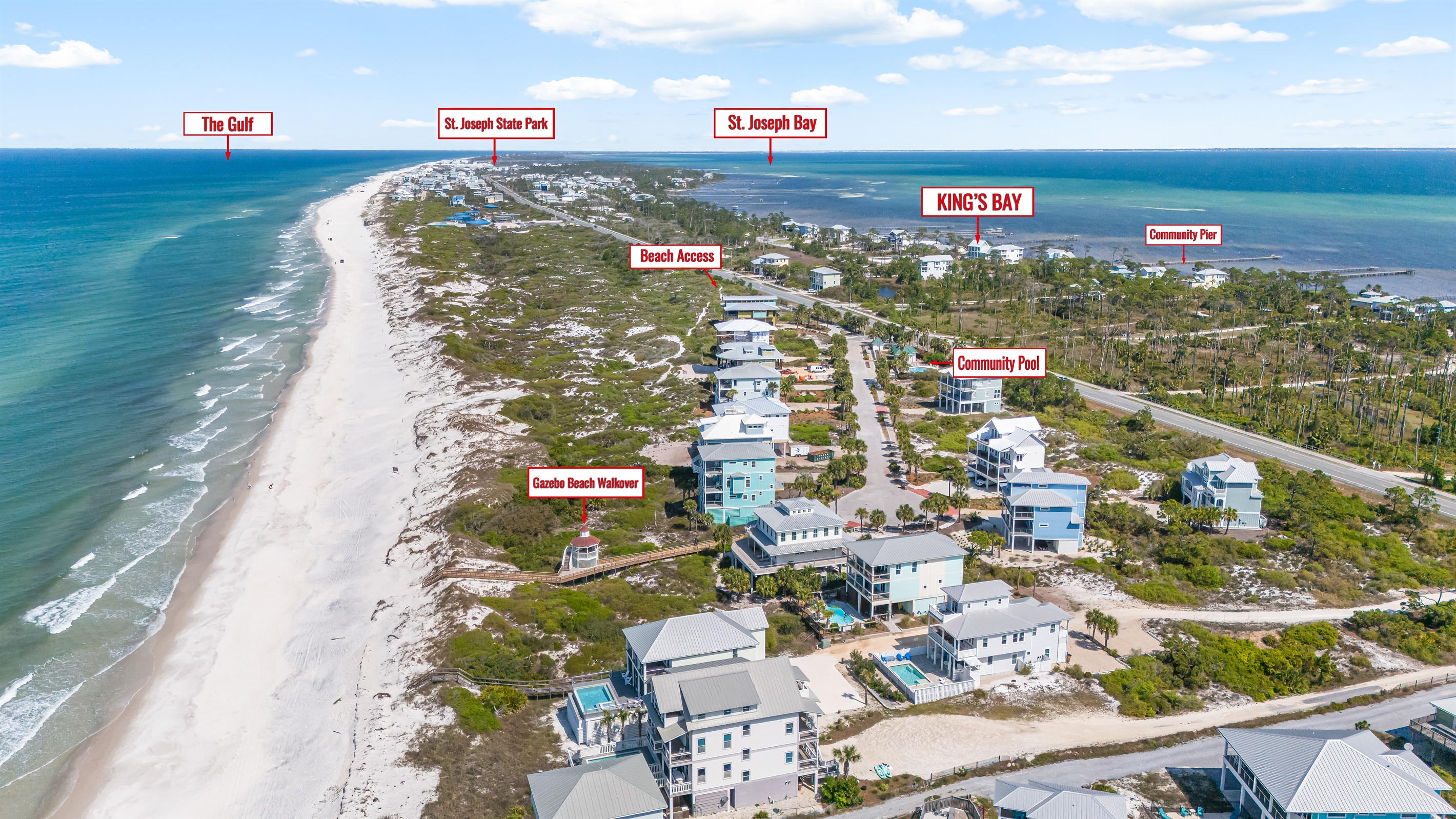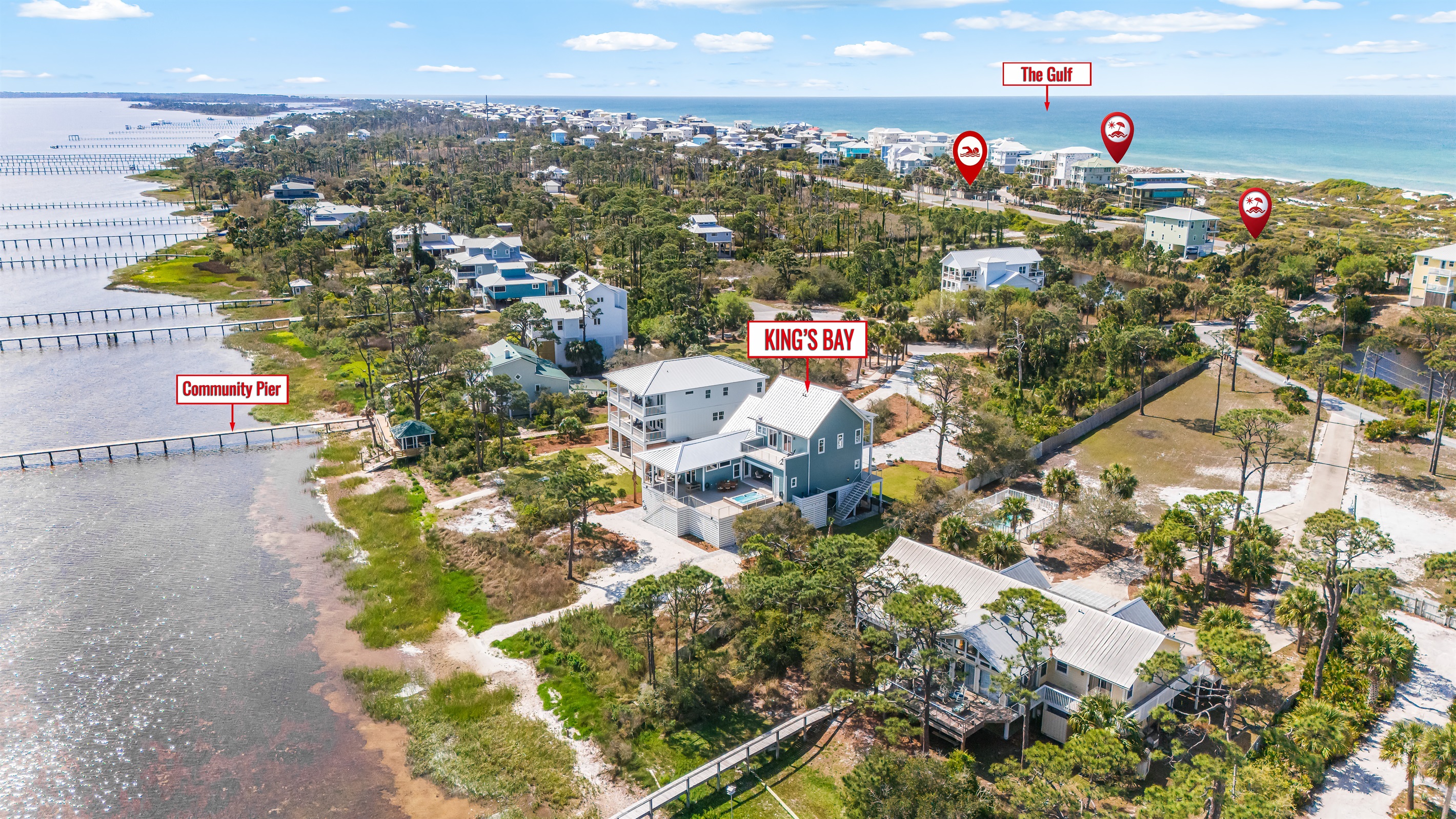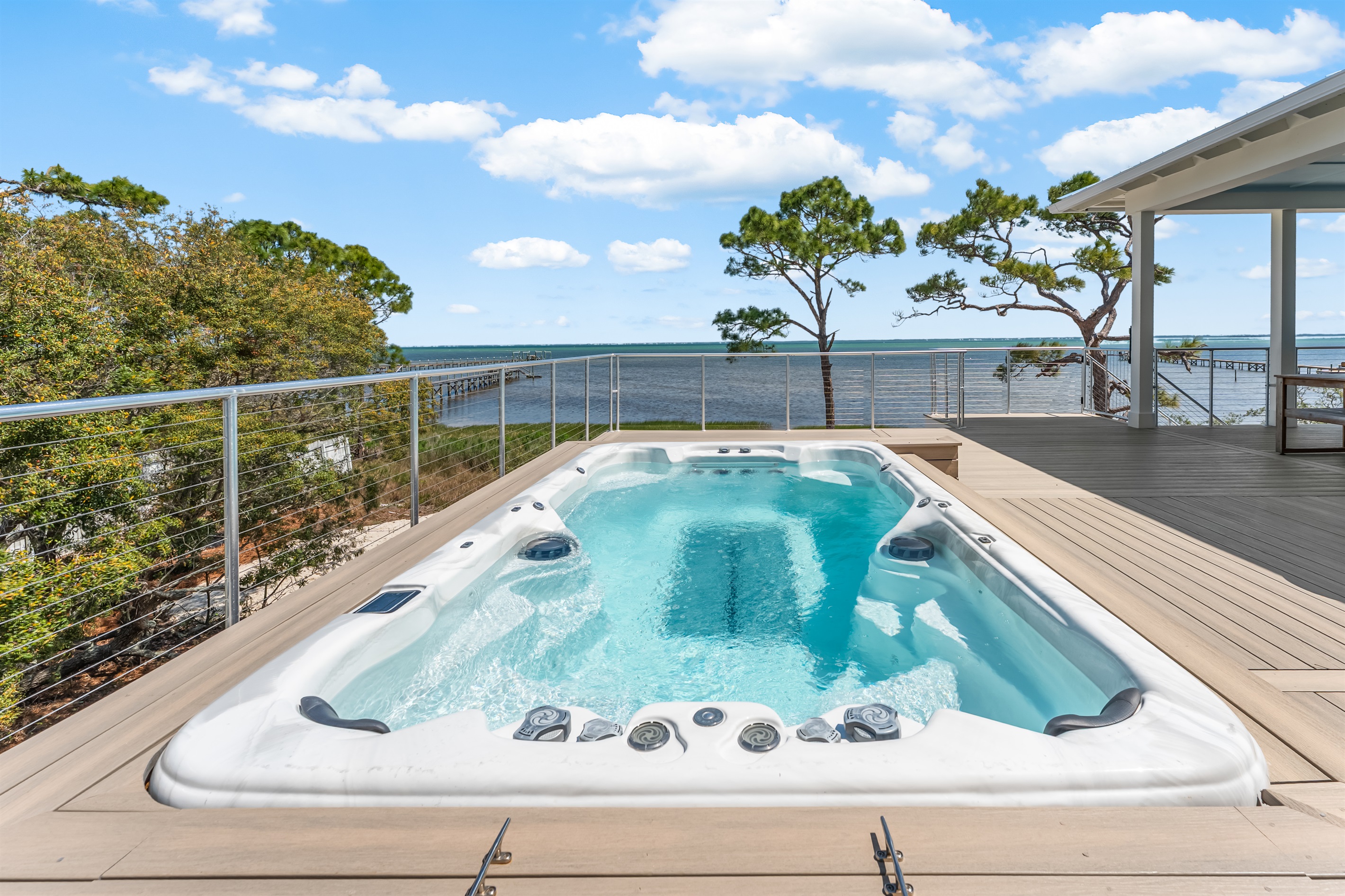 Discover King's Bay, a luxurious North Cape San Blas bayfront home nestled along the serene Forgotten Coast—only steps from the beach! With 2,930 square feet of pet-friendly living space, this 5-bedroom, 6.5-bathroom retreat comfortably sleeps 12. Enjoy stunning Bay and Gulf views, a private swim spa, and access to the community pool, dock, and beach. It's the perfect destination for coastal adventure!