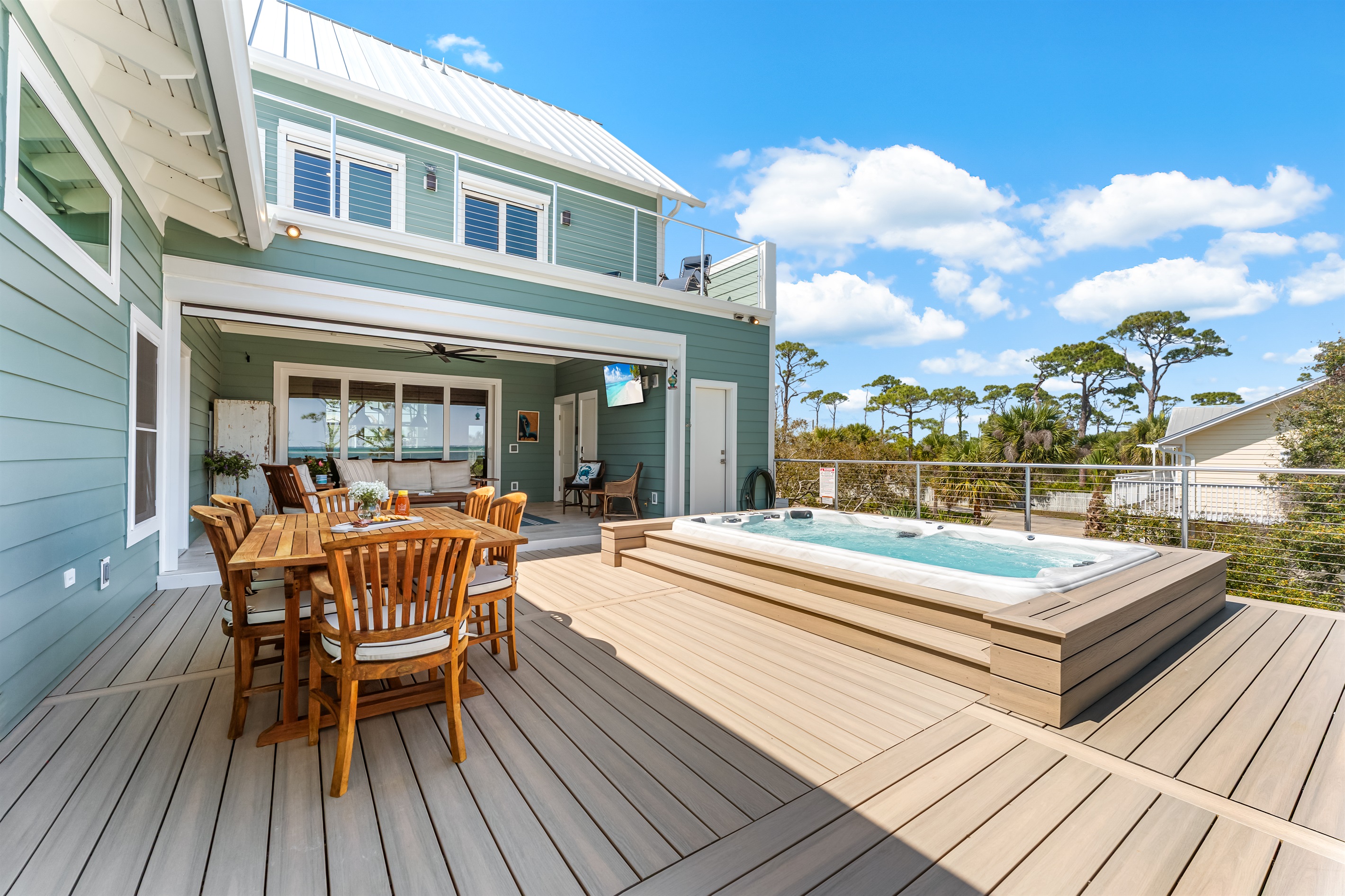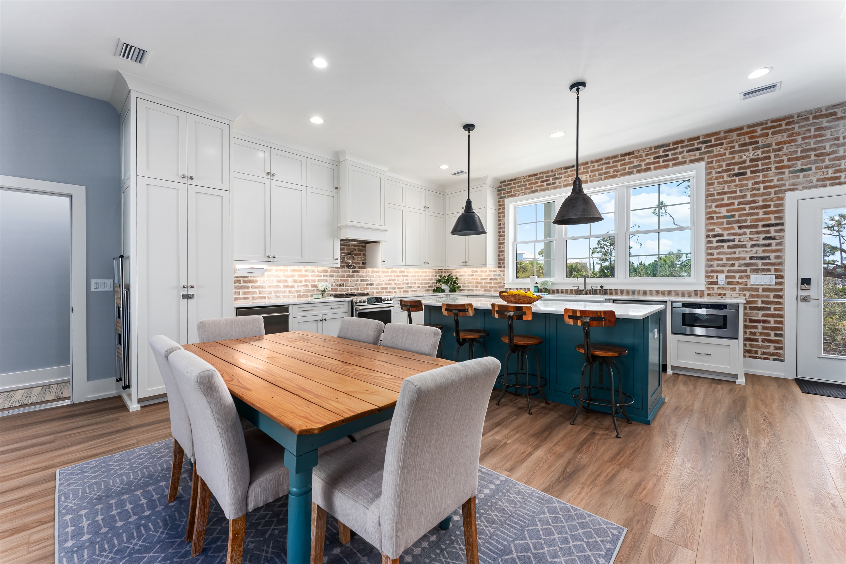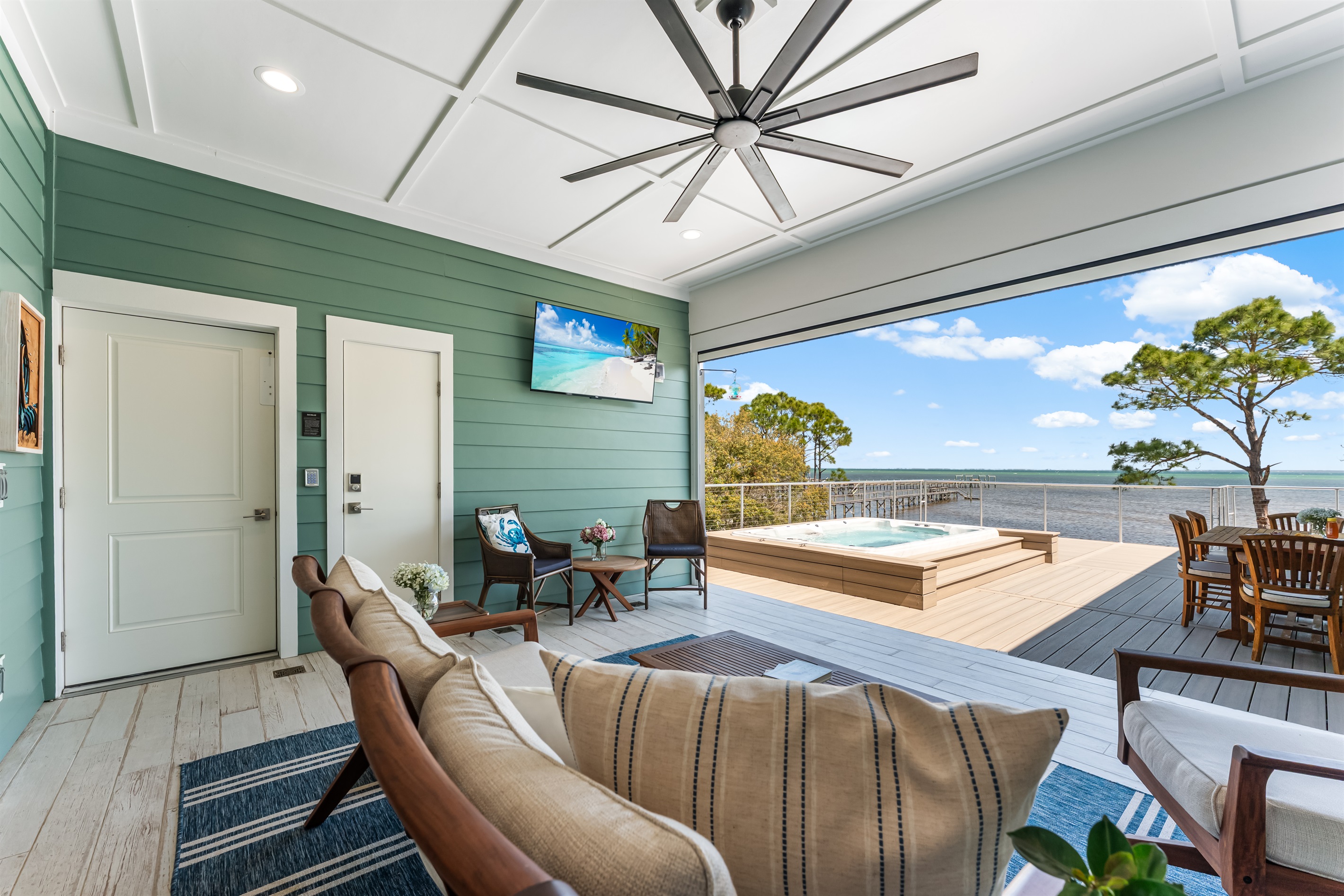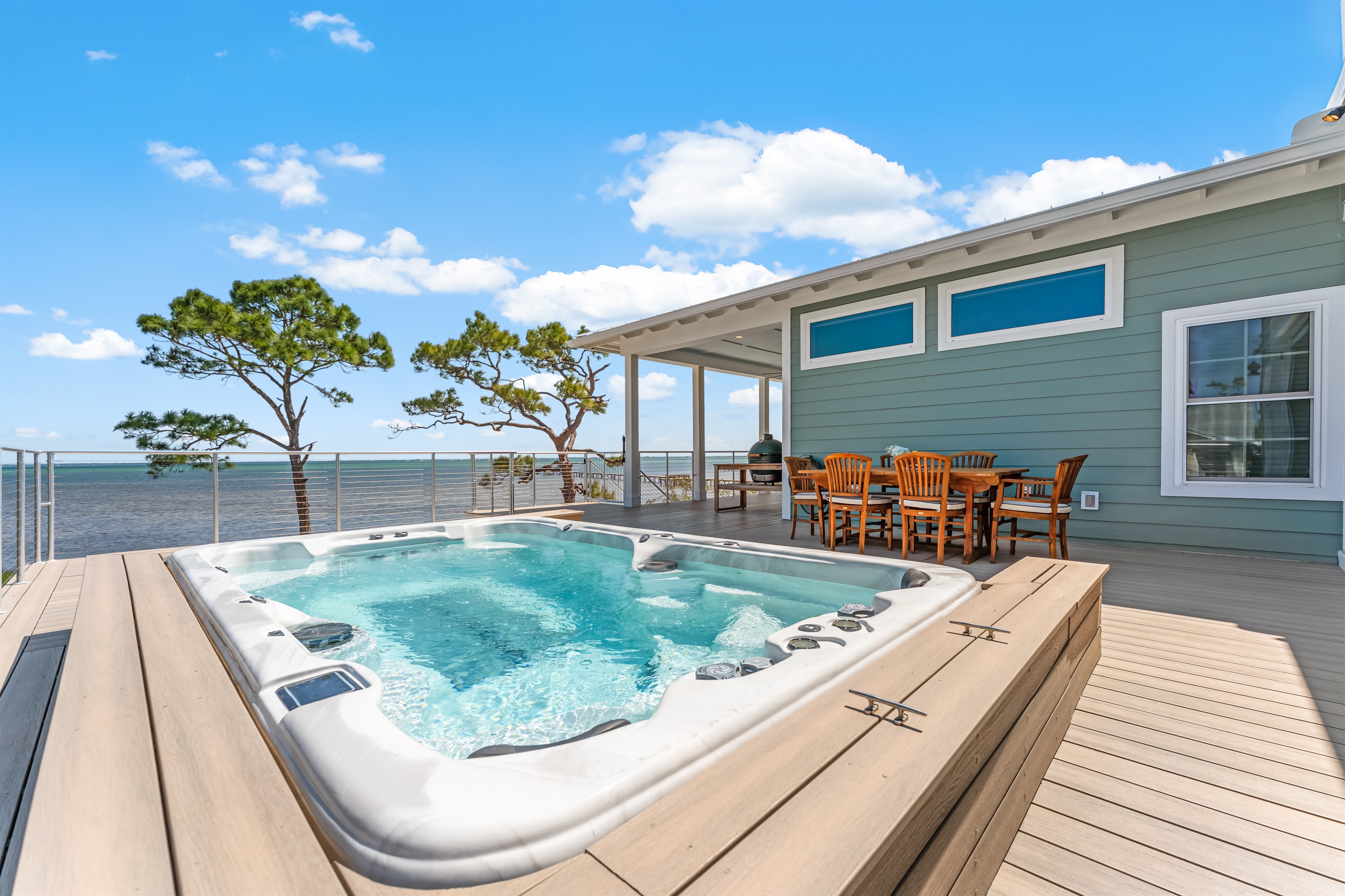 The kitchen and dining area blend exposed brick, high-end appliances, and ample seating at the 4-stool breakfast bar or 6-chair traditional dining table for the ultimate gathering spot. A small coffee bar adds convenience. A sliding glass wall separates the kitchen and dining area from the covered porch and deck, which can be opened for an outdoor kitchen experience. Fire up the Big Green Egg or gas grill for a flavorful feast, dine around the 6-person table, or take a refreshing swim in the private spa to end the perfect day.