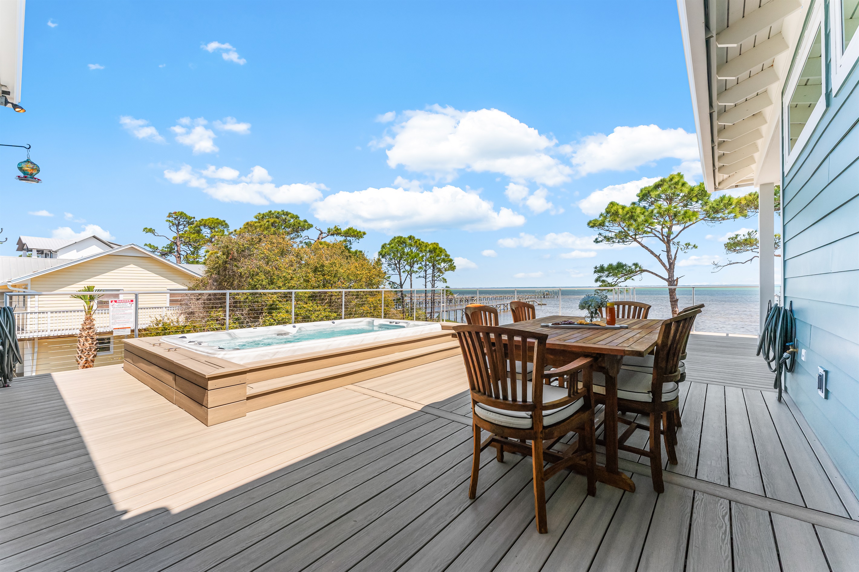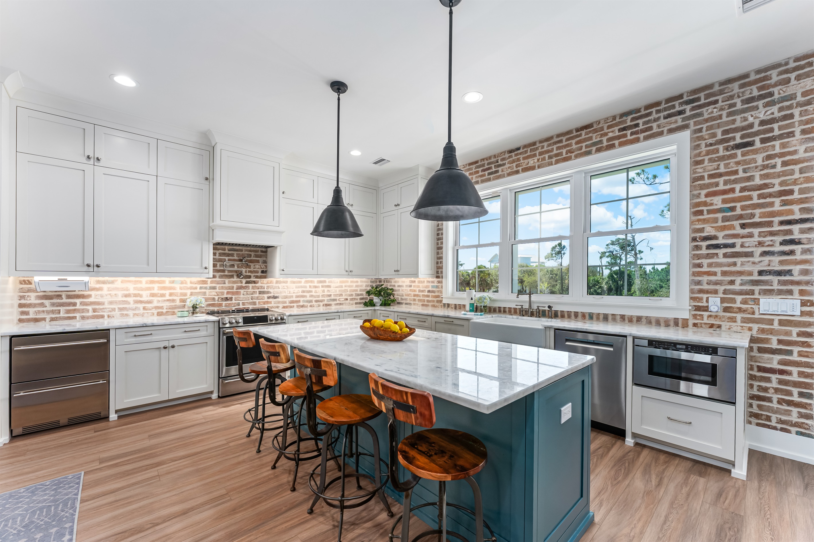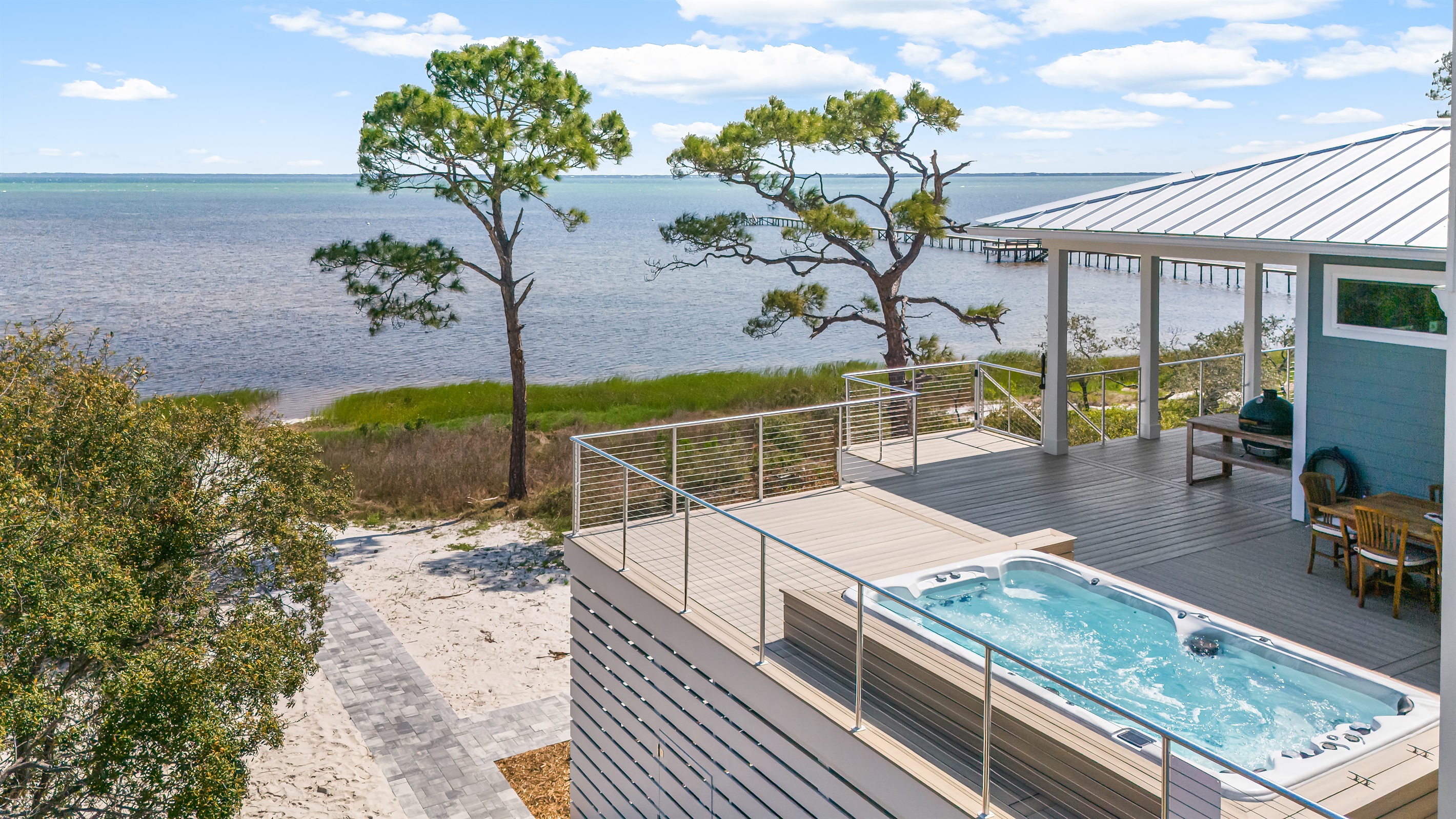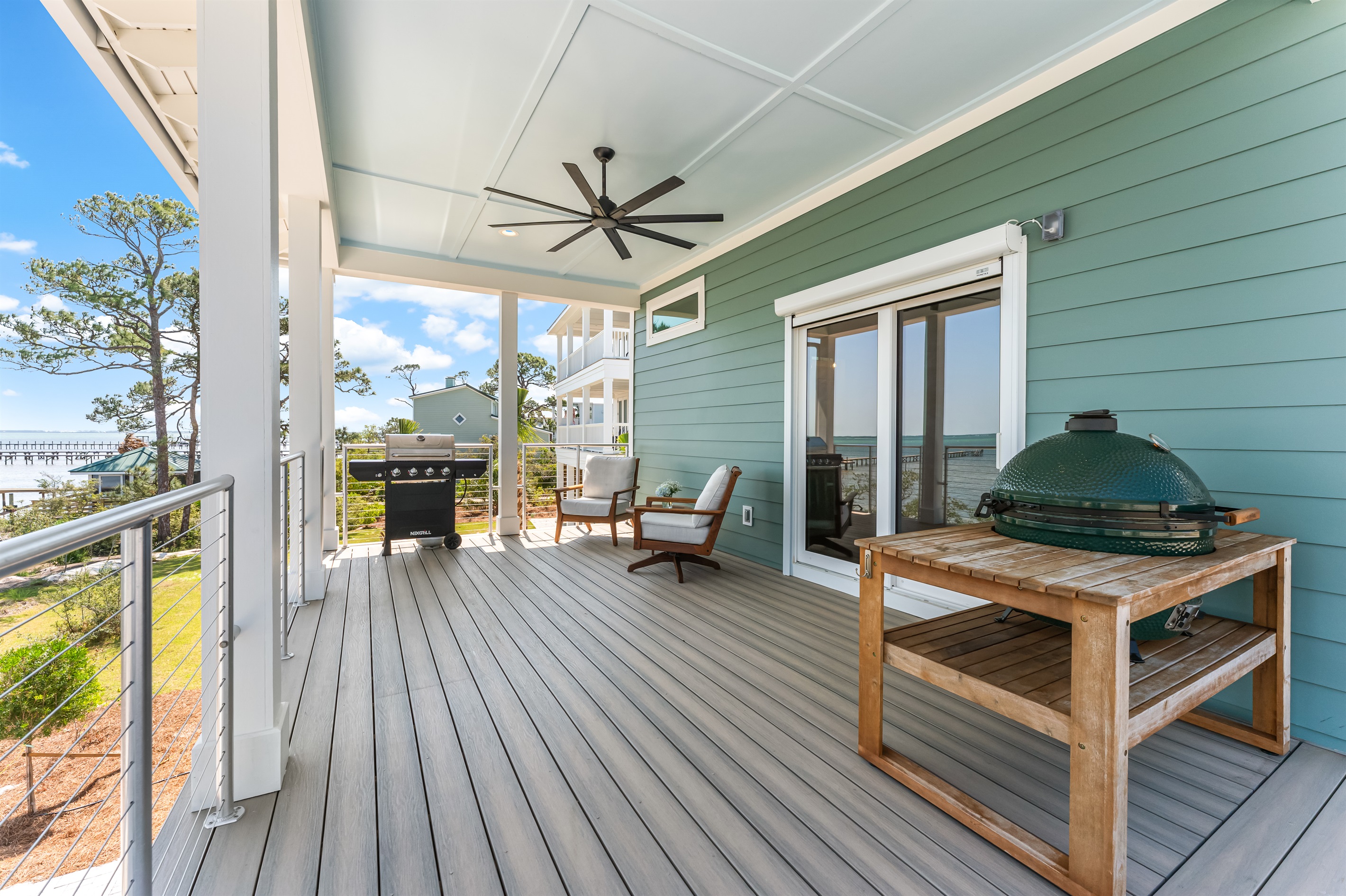 The kitchen and dining area blend exposed brick, high-end appliances, and ample seating at the 4-stool breakfast bar or 6-chair traditional dining table for the ultimate gathering spot. A small coffee bar adds convenience. A sliding glass wall separates the kitchen and dining area from the covered porch and deck, which can be opened for an outdoor kitchen experience. Fire up the Big Green Egg or gas grill for a flavorful feast, dine around the 6-person table, or take a refreshing swim in the private spa to end the perfect day.