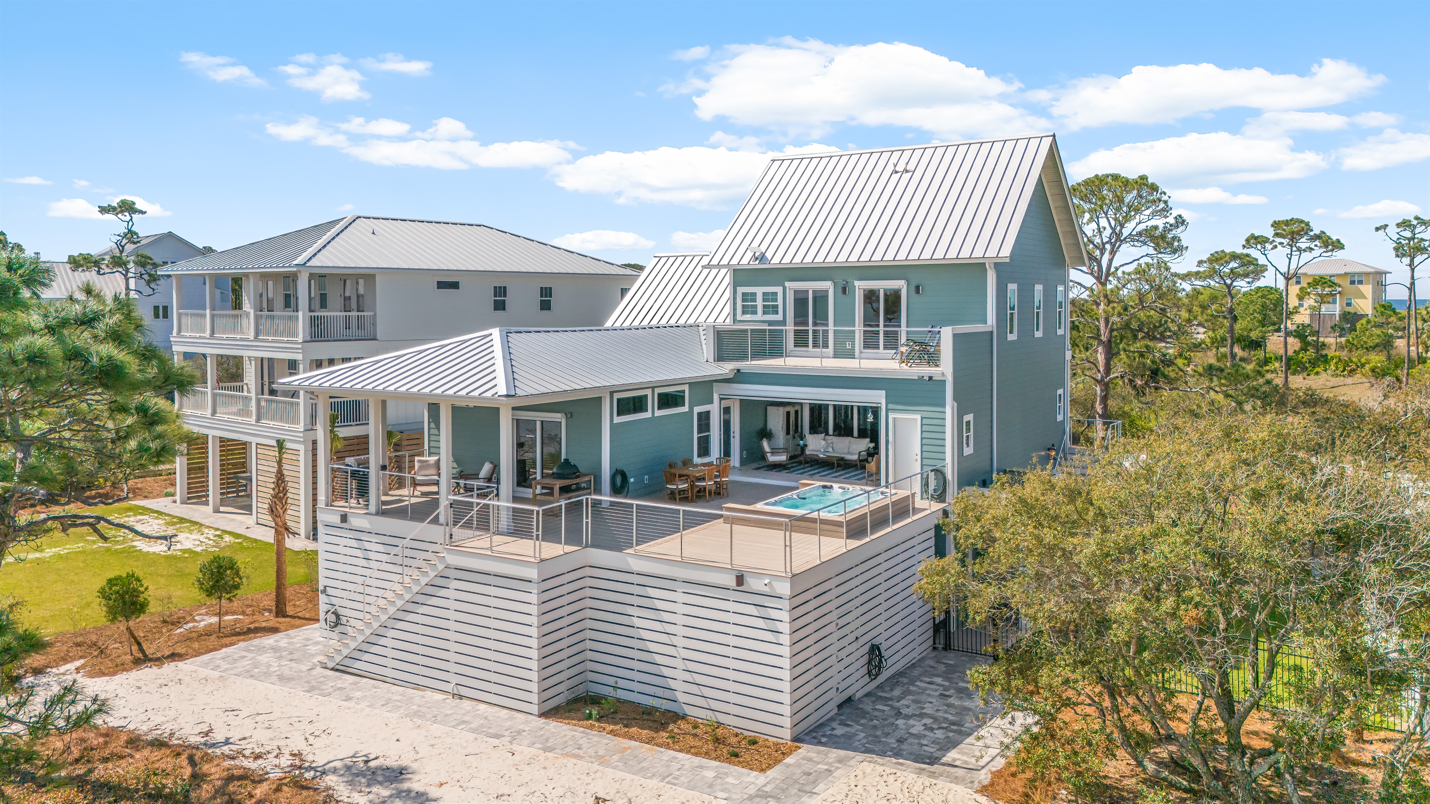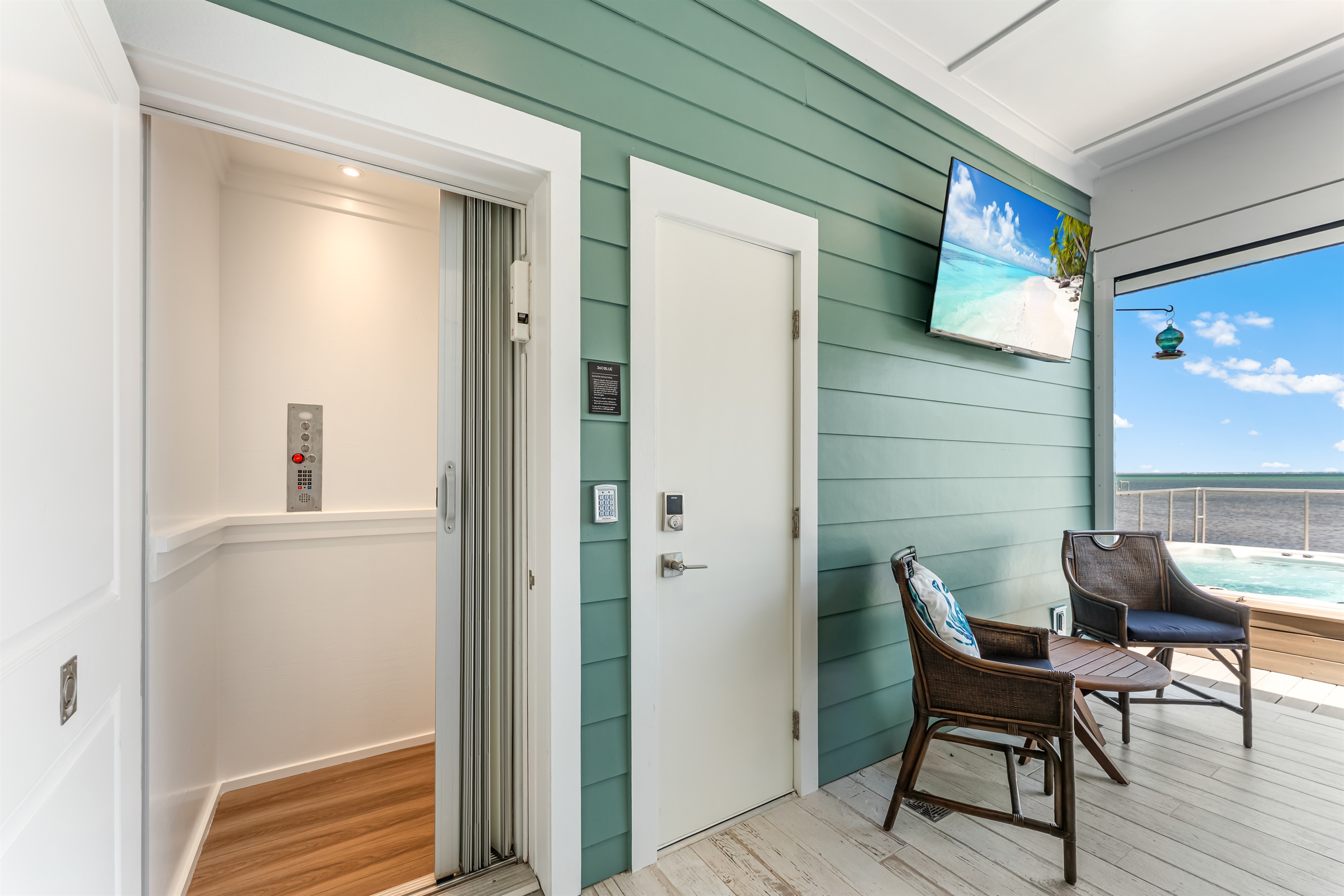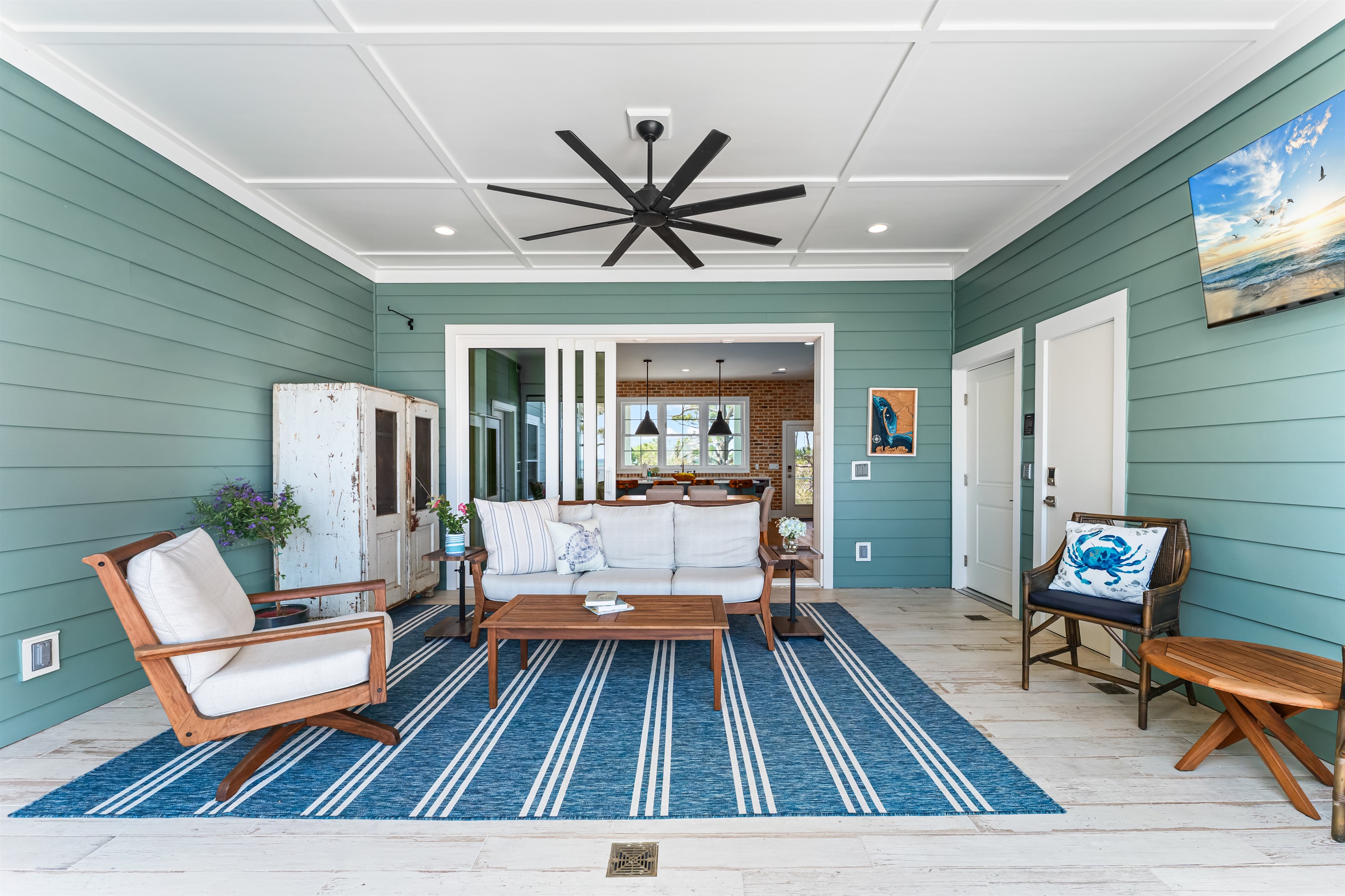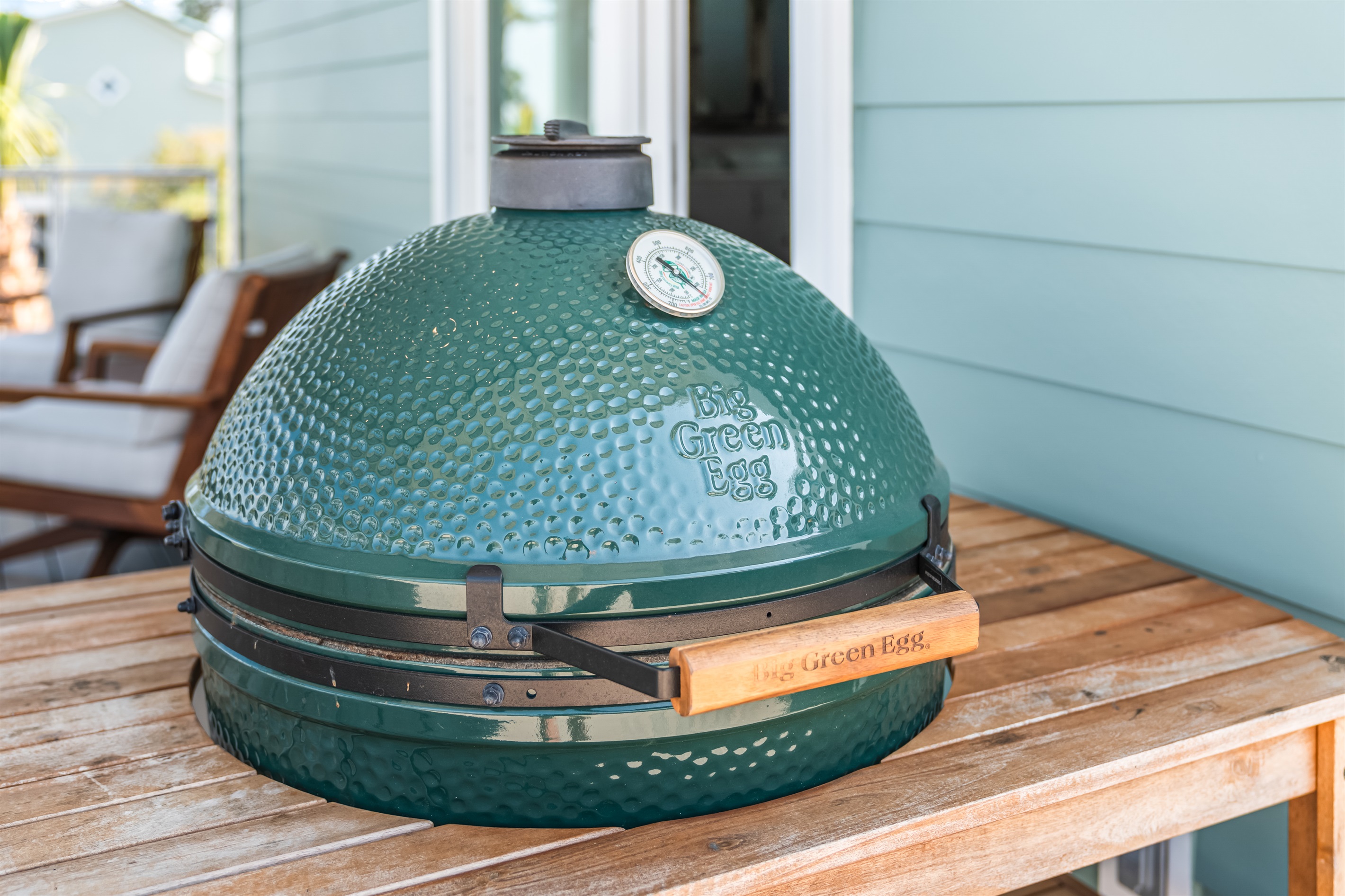 The kitchen and dining area blend exposed brick, high-end appliances, and ample seating at the 4-stool breakfast bar or 6-chair traditional dining table for the ultimate gathering spot. A small coffee bar adds convenience. A sliding glass wall separates the kitchen and dining area from the covered porch and deck, which can be opened for an outdoor kitchen experience. Fire up the Big Green Egg or gas grill for a flavorful feast, dine around the 6-person table, or take a refreshing swim in the private spa to end the perfect day.