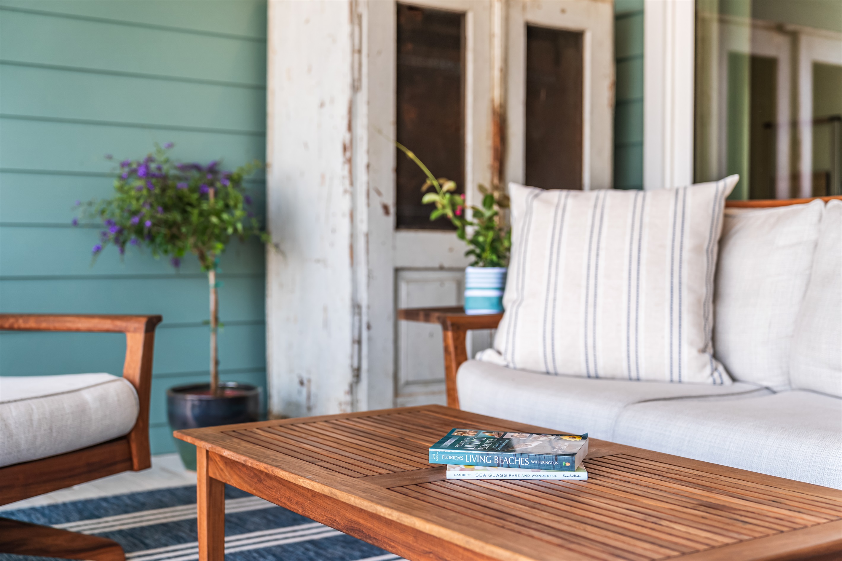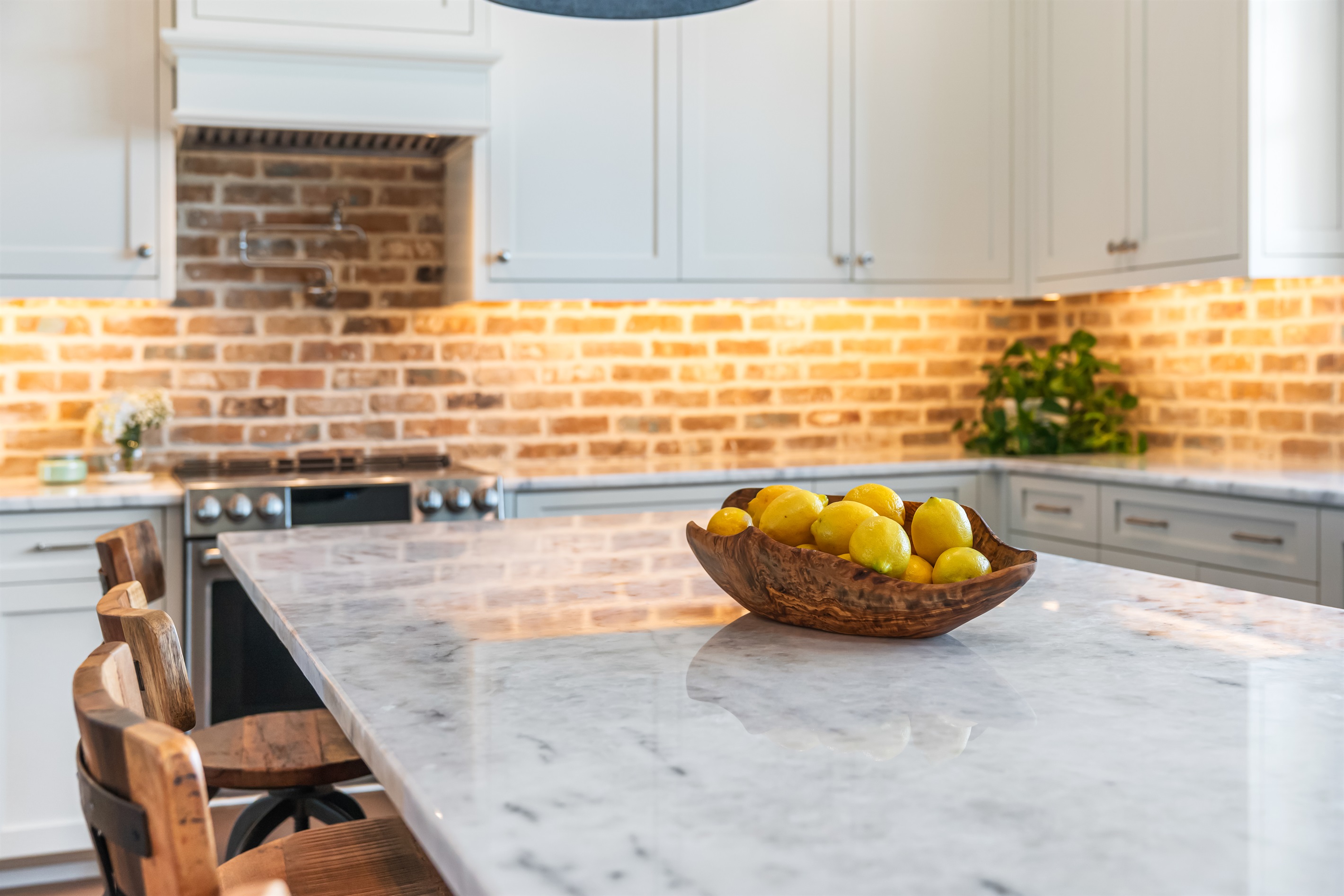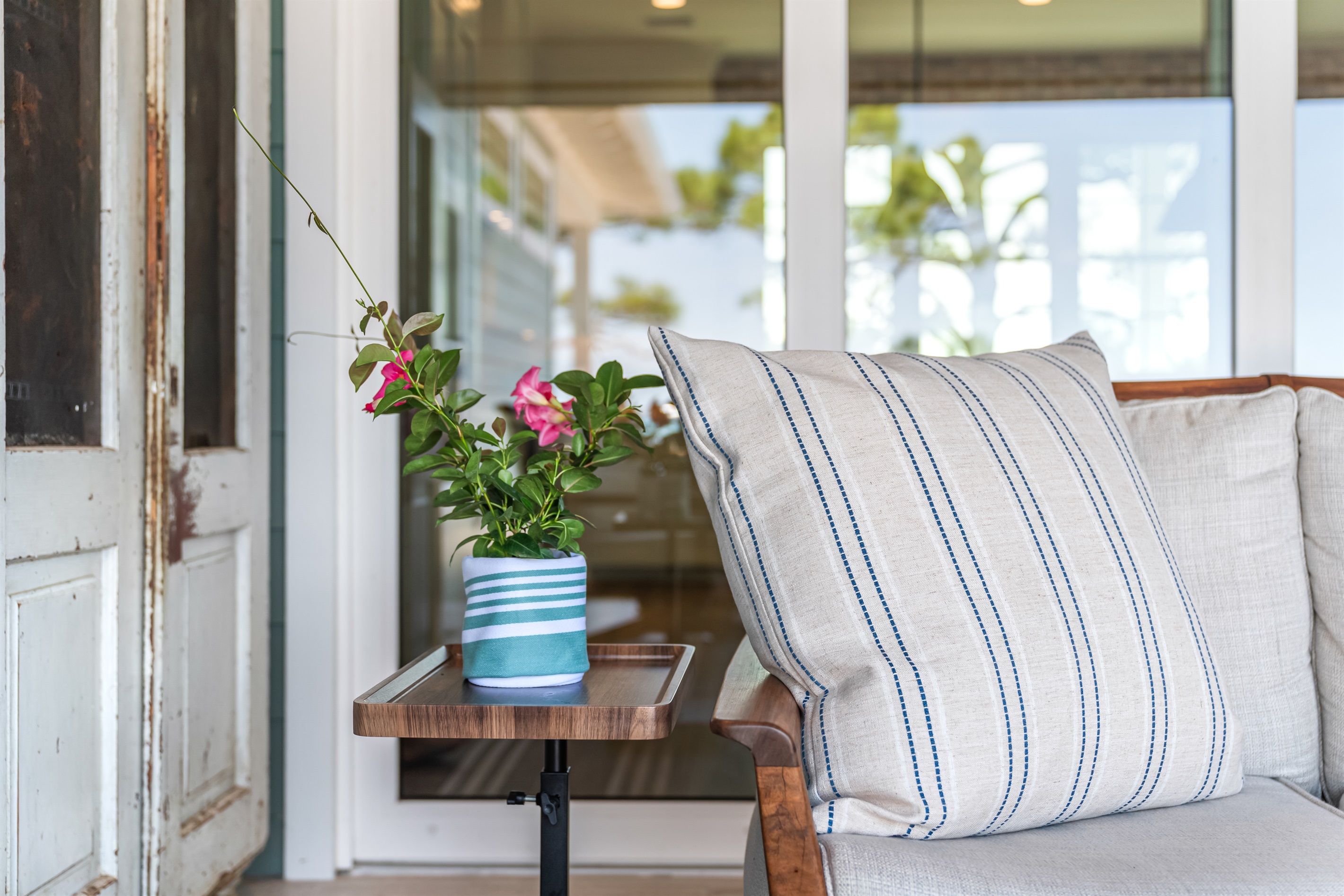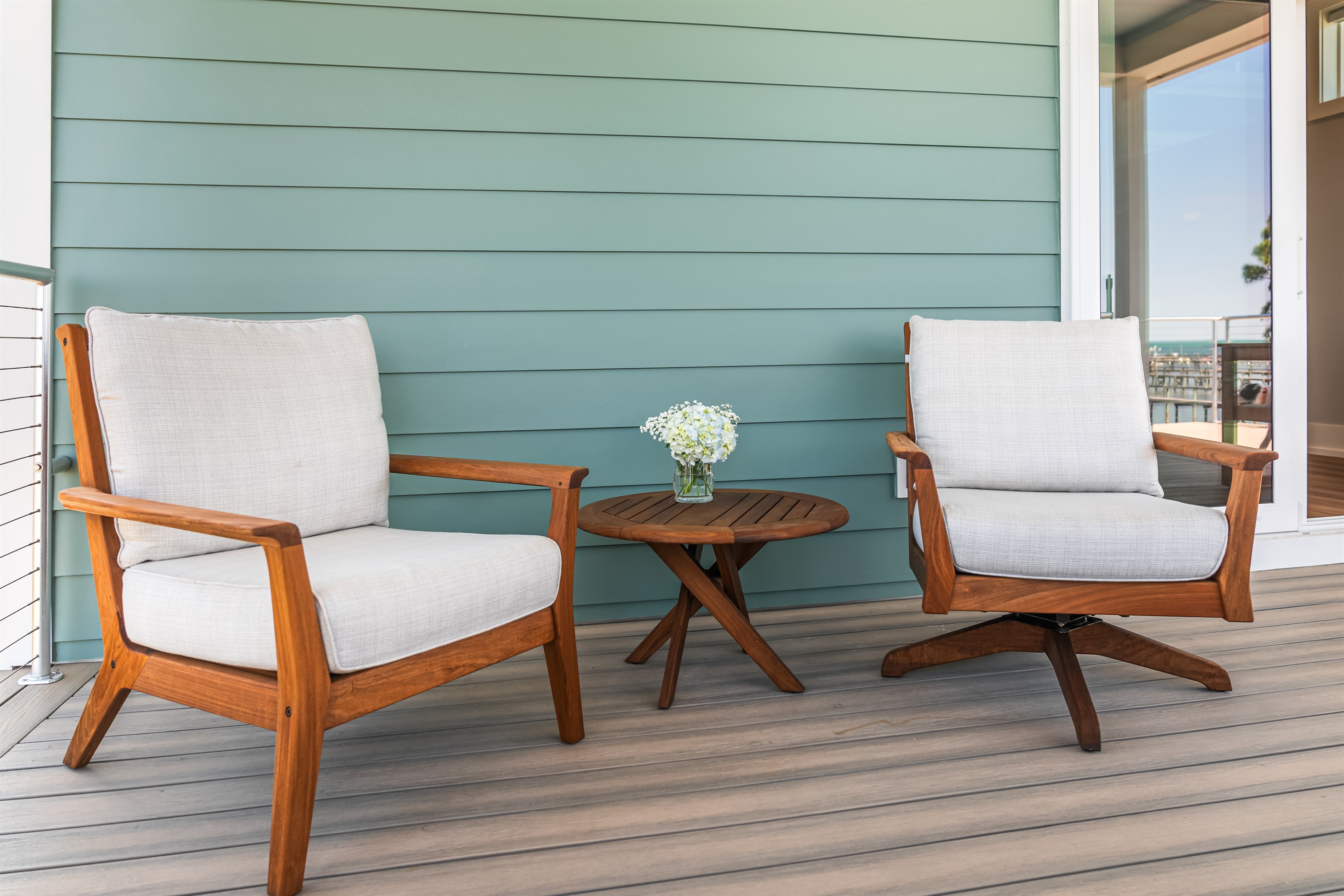 The kitchen and dining area blend exposed brick, high-end appliances, and ample seating at the 4-stool breakfast bar or 6-chair traditional dining table for the ultimate gathering spot. A small coffee bar adds convenience. A sliding glass wall separates the kitchen and dining area from the covered porch and deck, which can be opened for an outdoor kitchen experience. Fire up the Big Green Egg or gas grill for a flavorful feast, dine around the 6-person table, or take a refreshing swim in the private spa to end the perfect day.