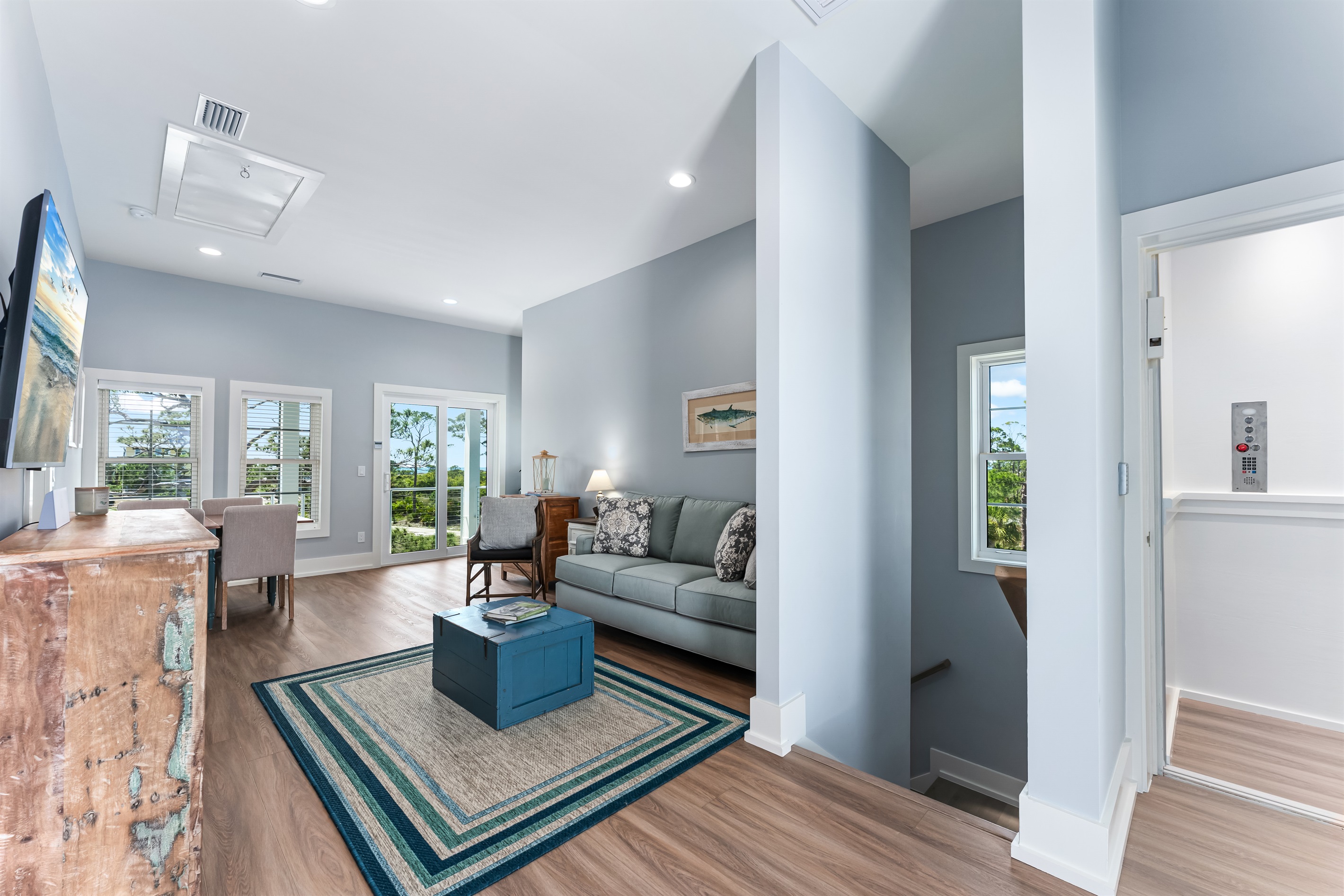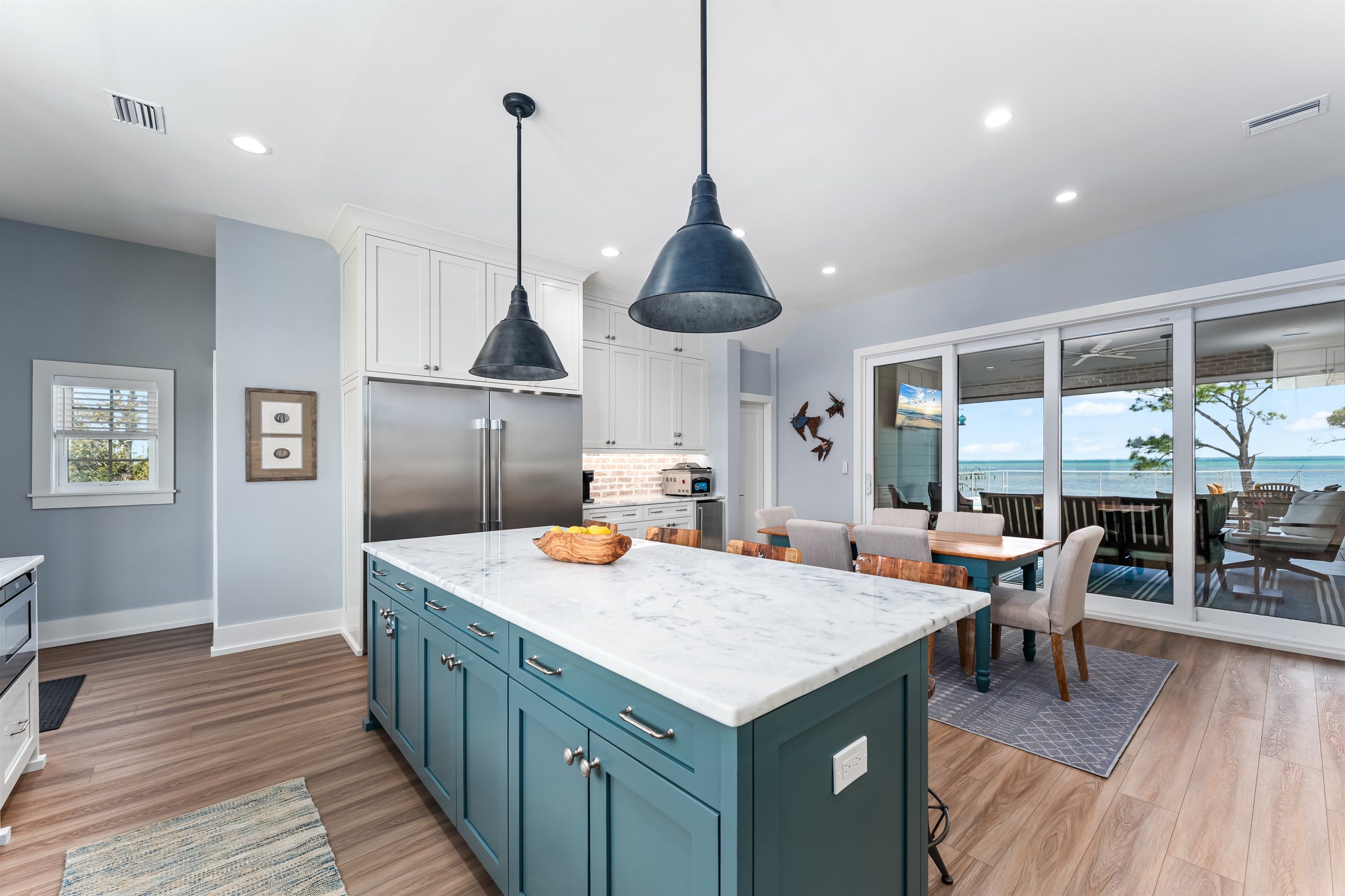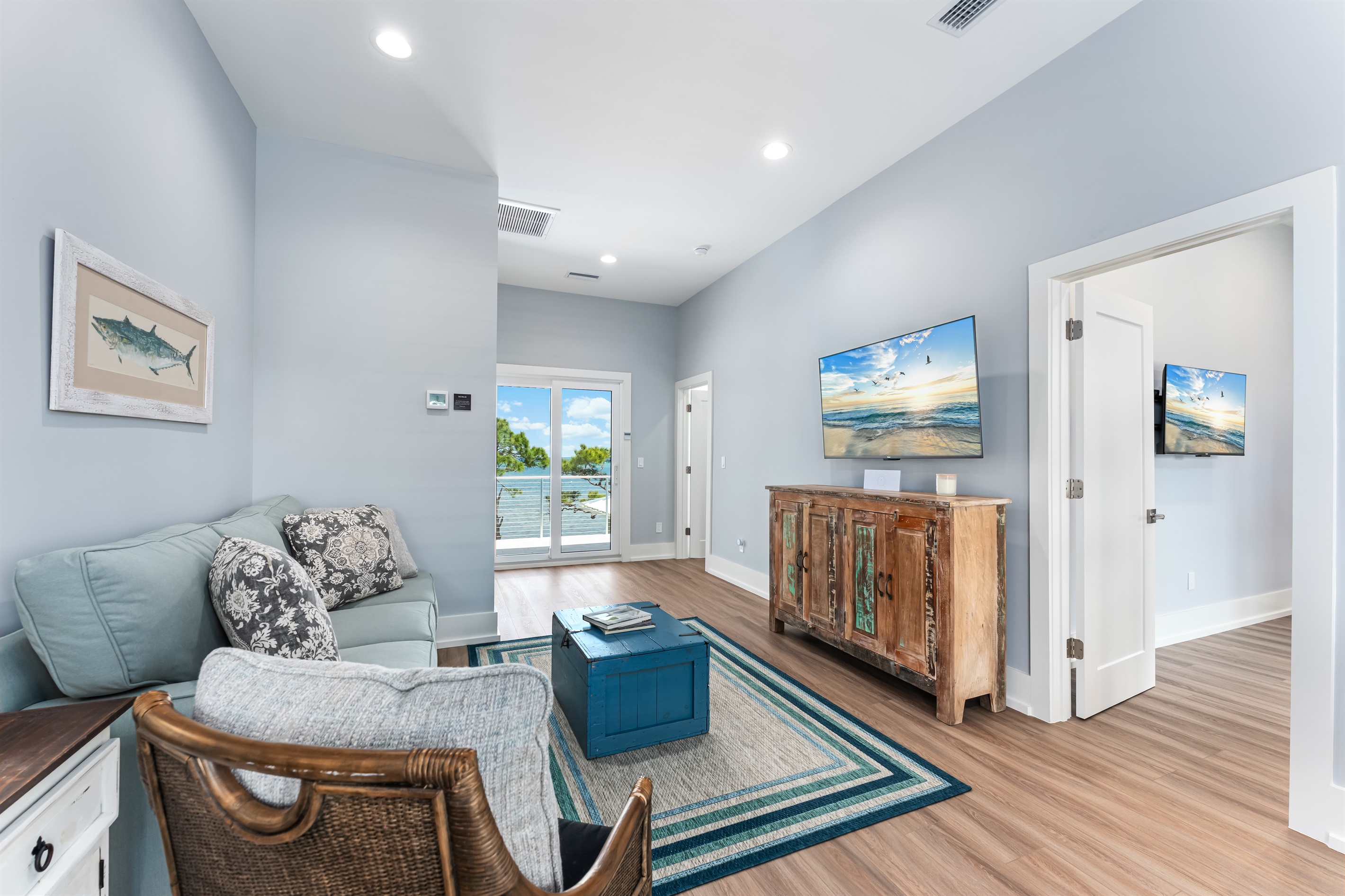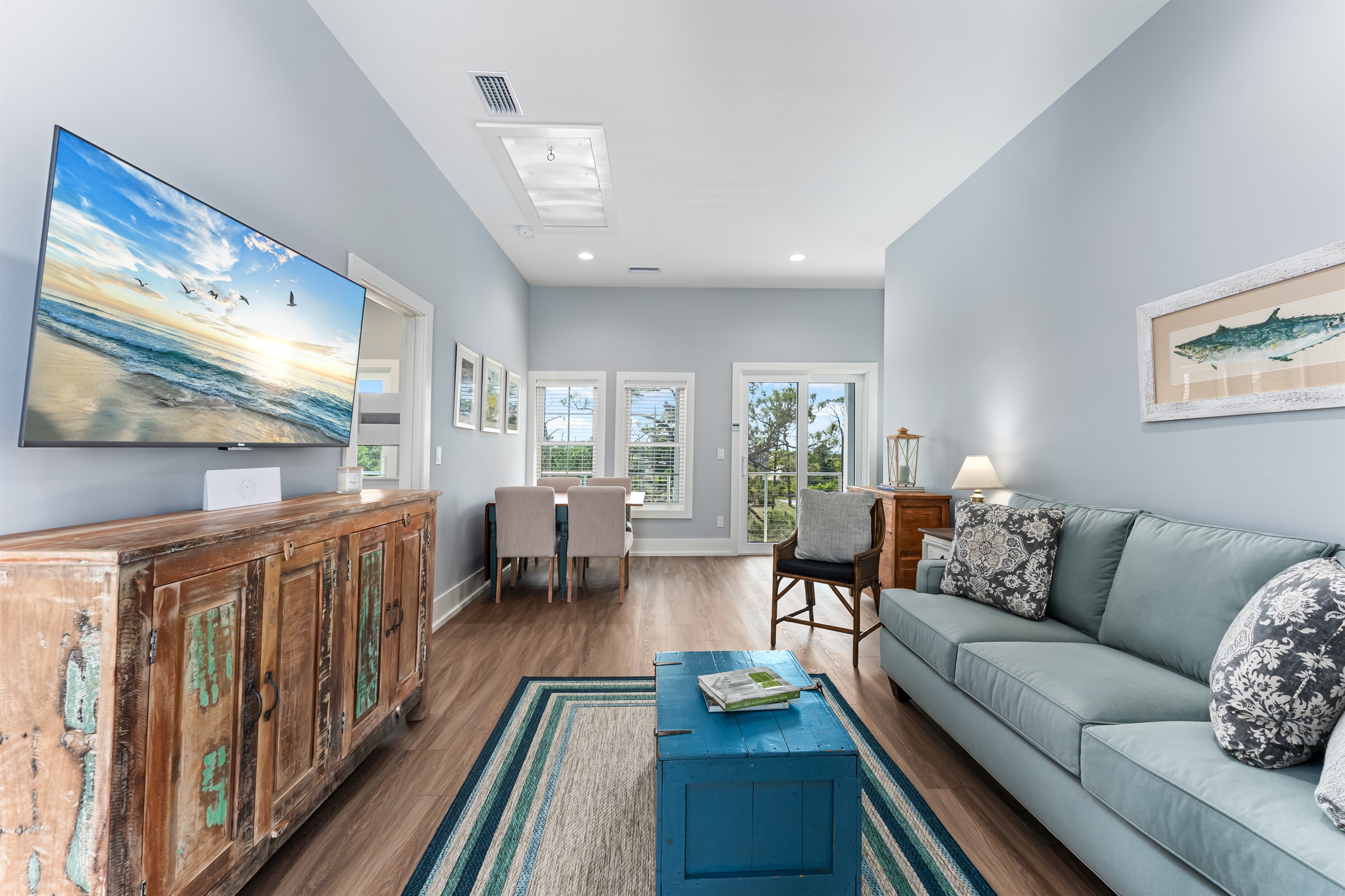 Upstairs, the main floor acts as the heart of this home, where soft blues and sandy beiges come alive under streams of natural light, framed by breathtaking coastal views. Sink into the L-shaped sectional in the cozy living room to plan the day's itinerary or enjoy a family movie night on the large TV.