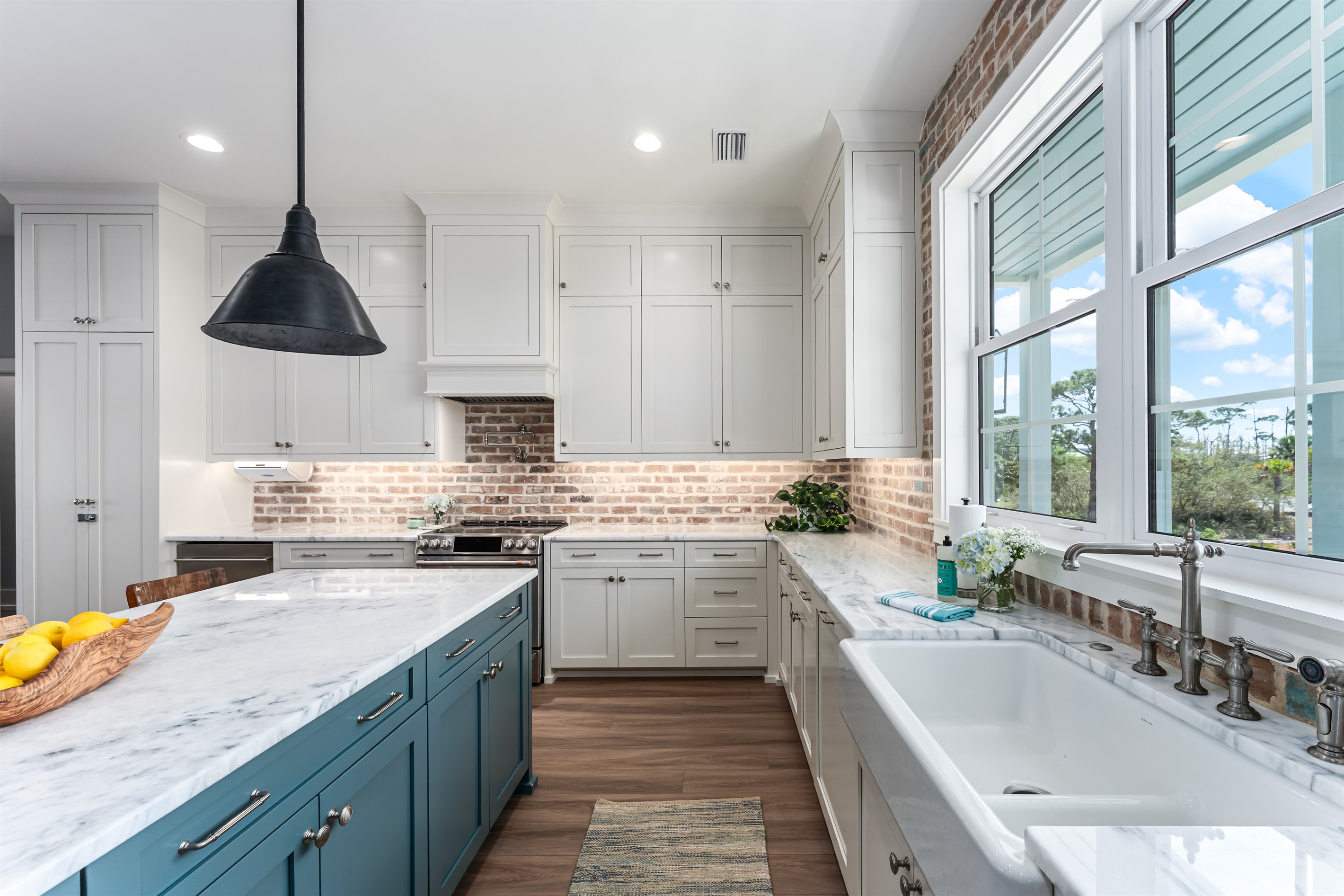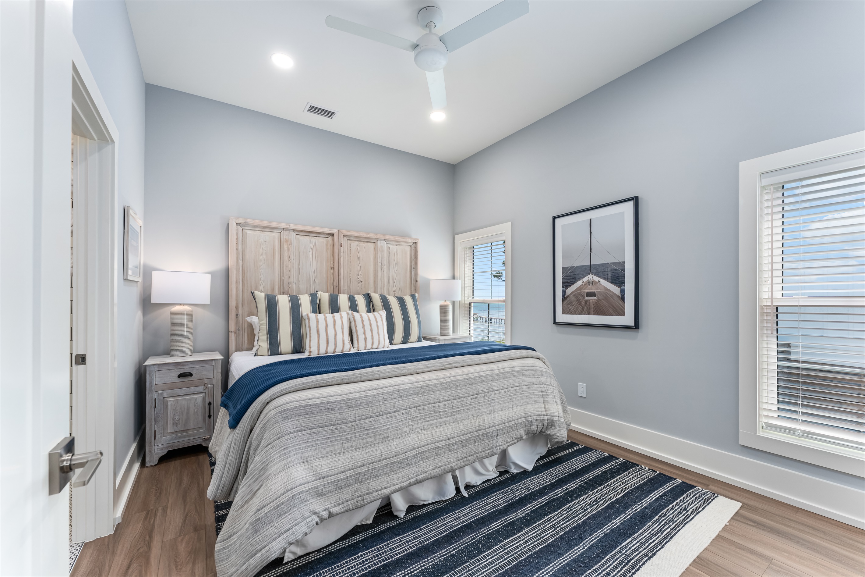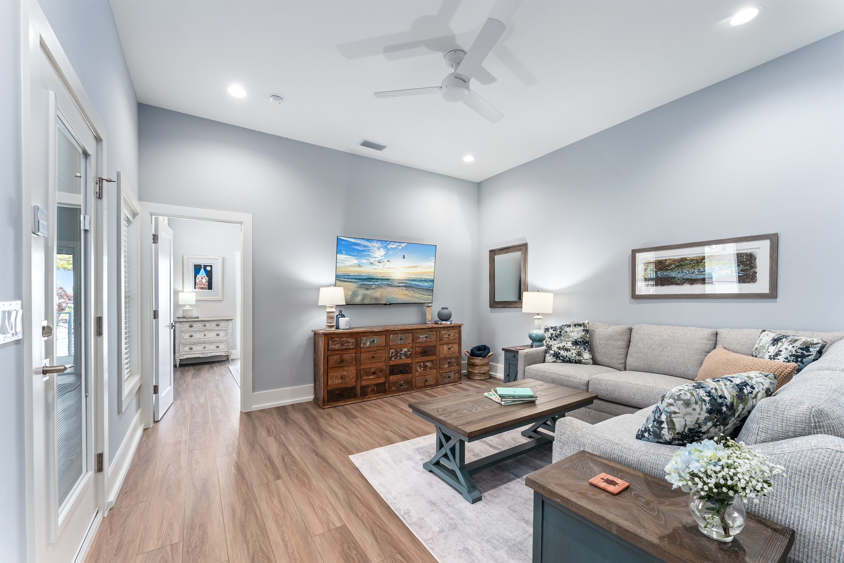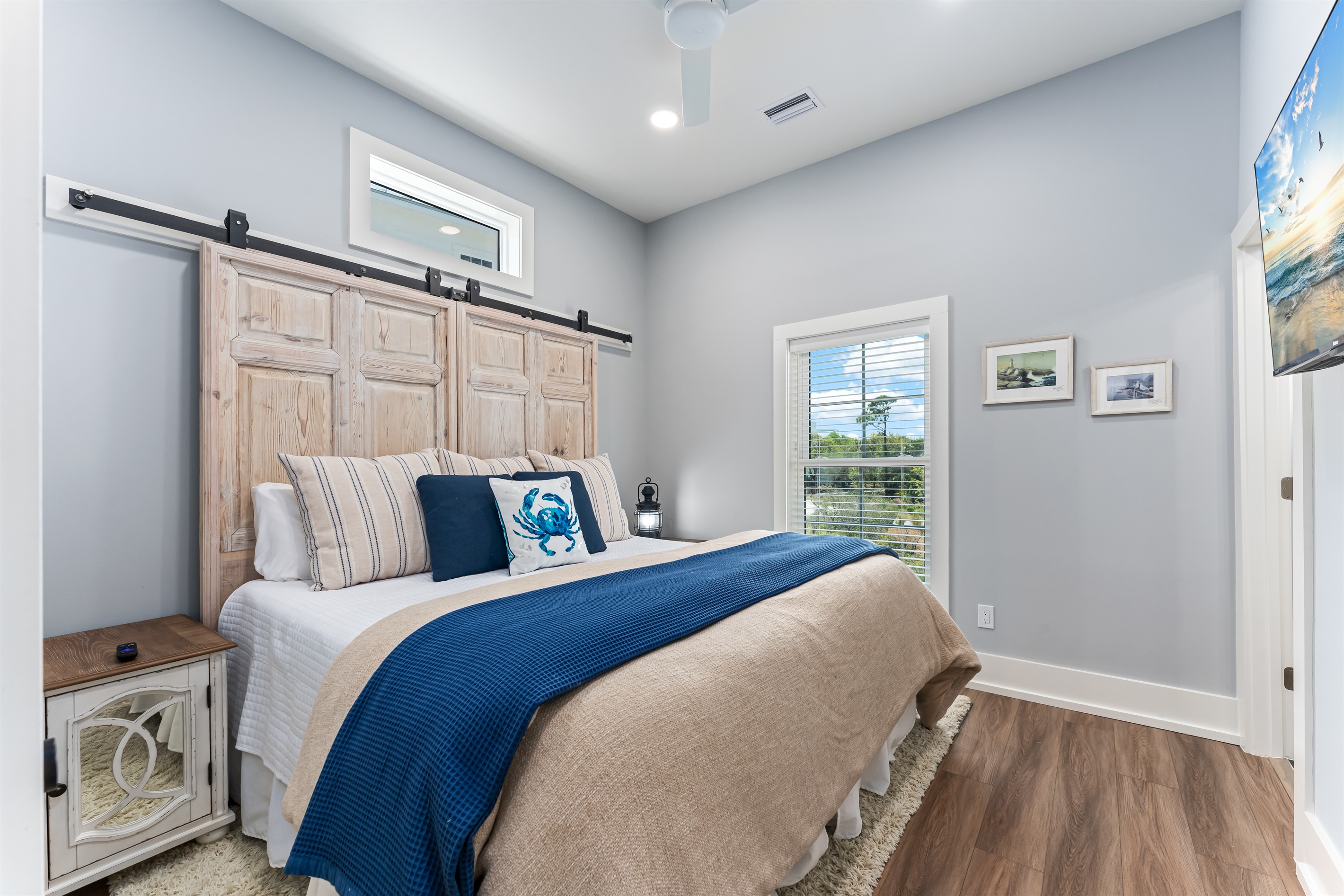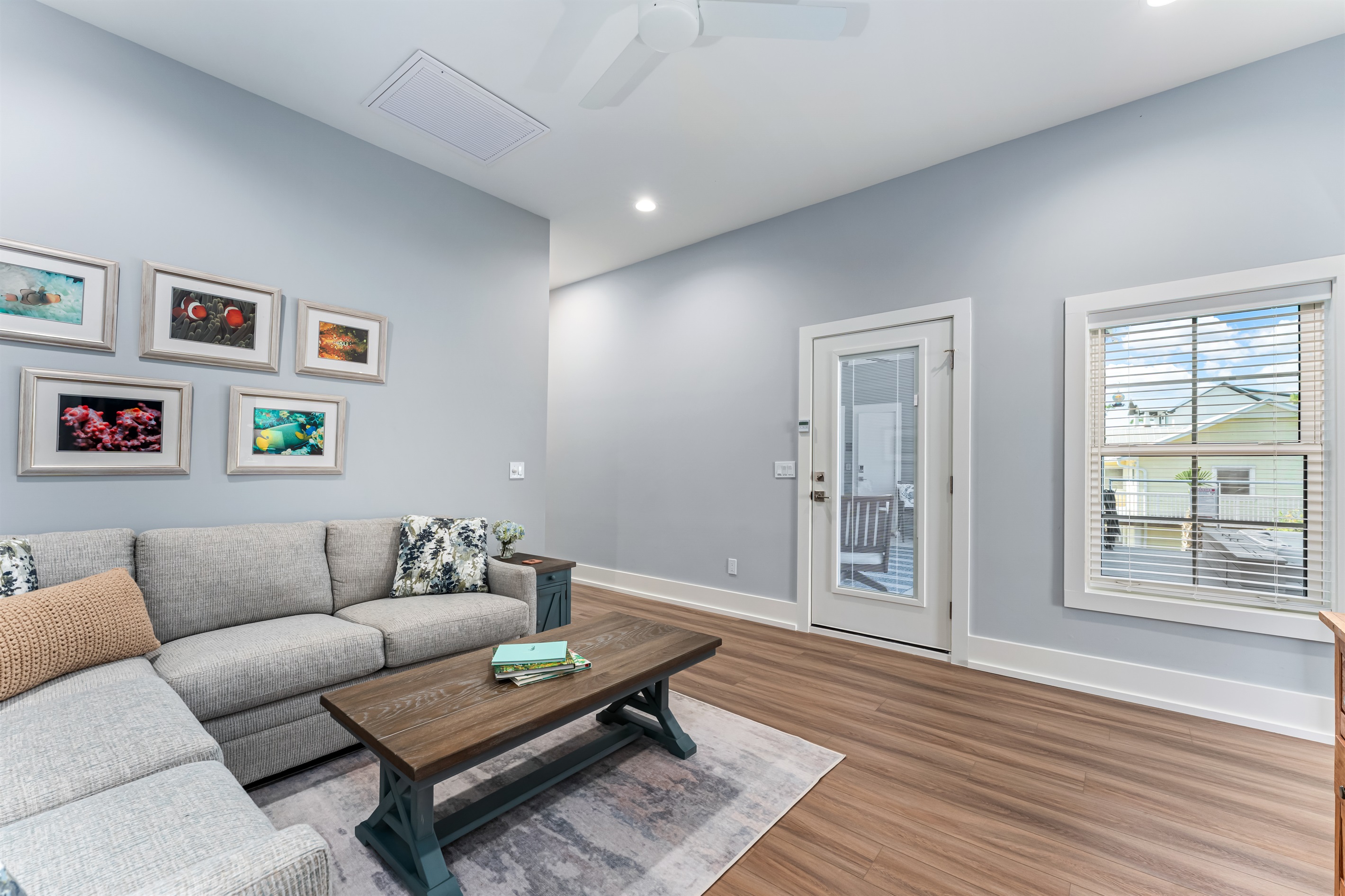 Upstairs, the main floor acts as the heart of this home, where soft blues and sandy beiges come alive under streams of natural light, framed by breathtaking coastal views. Sink into the L-shaped sectional in the cozy living room to plan the day's itinerary or enjoy a family movie night on the large TV.