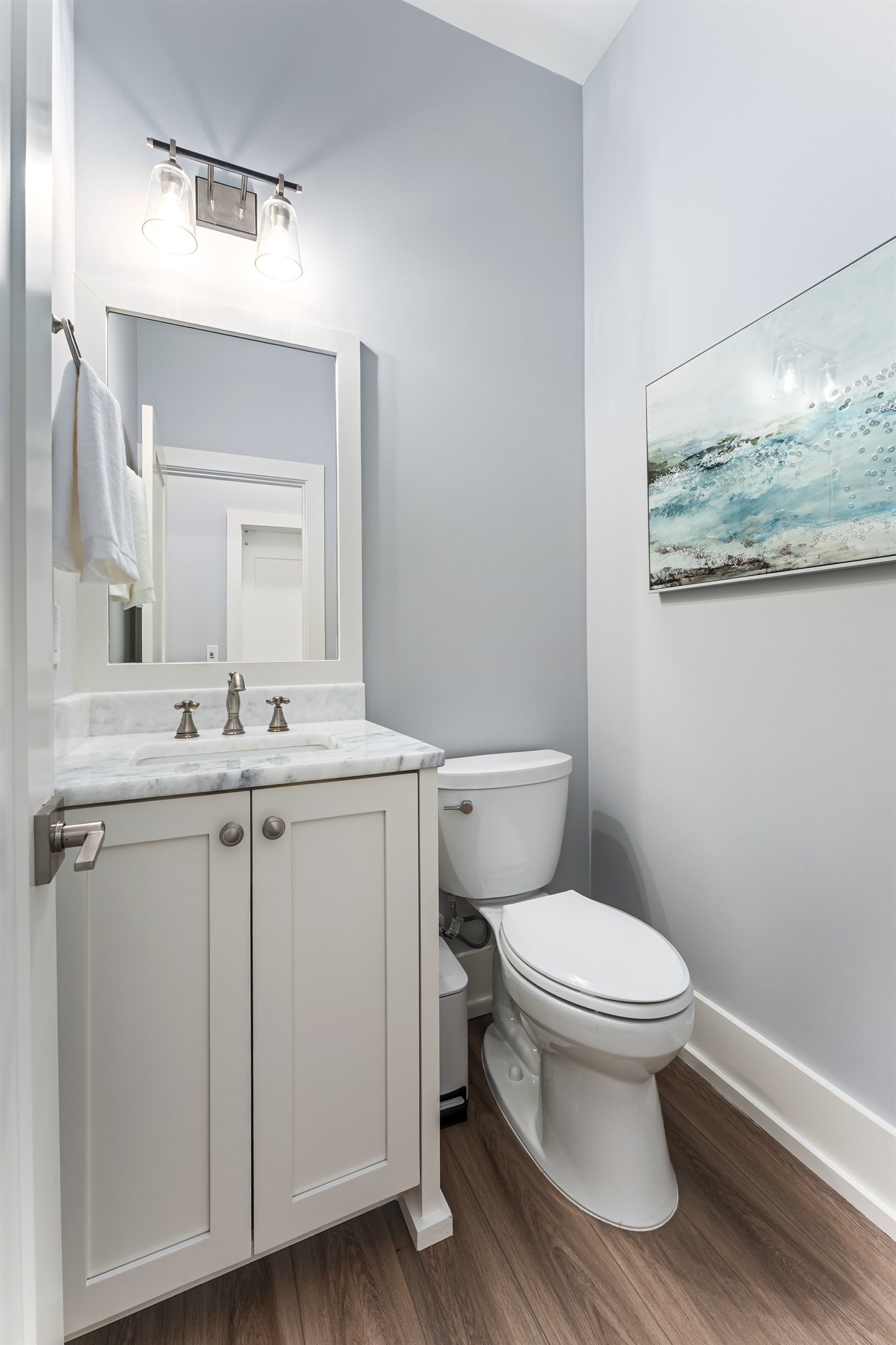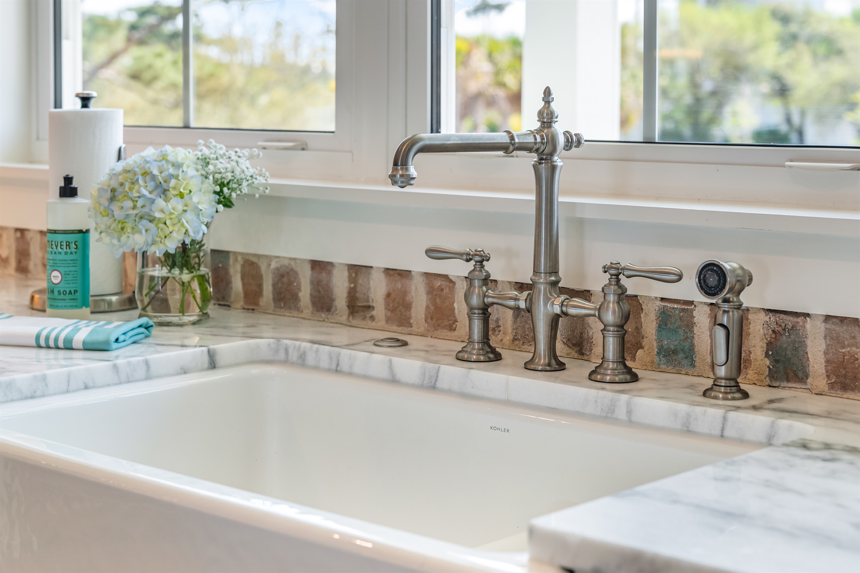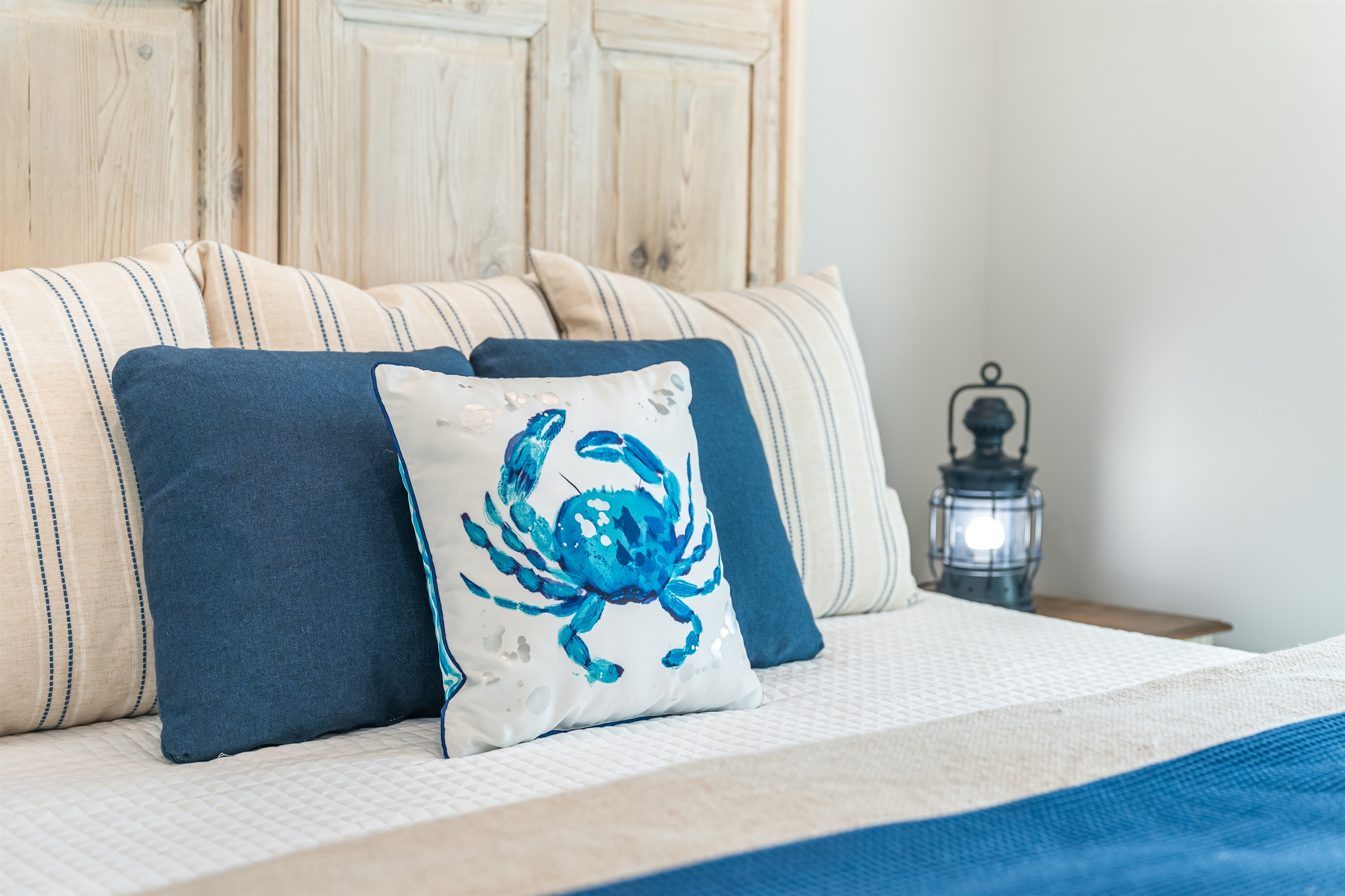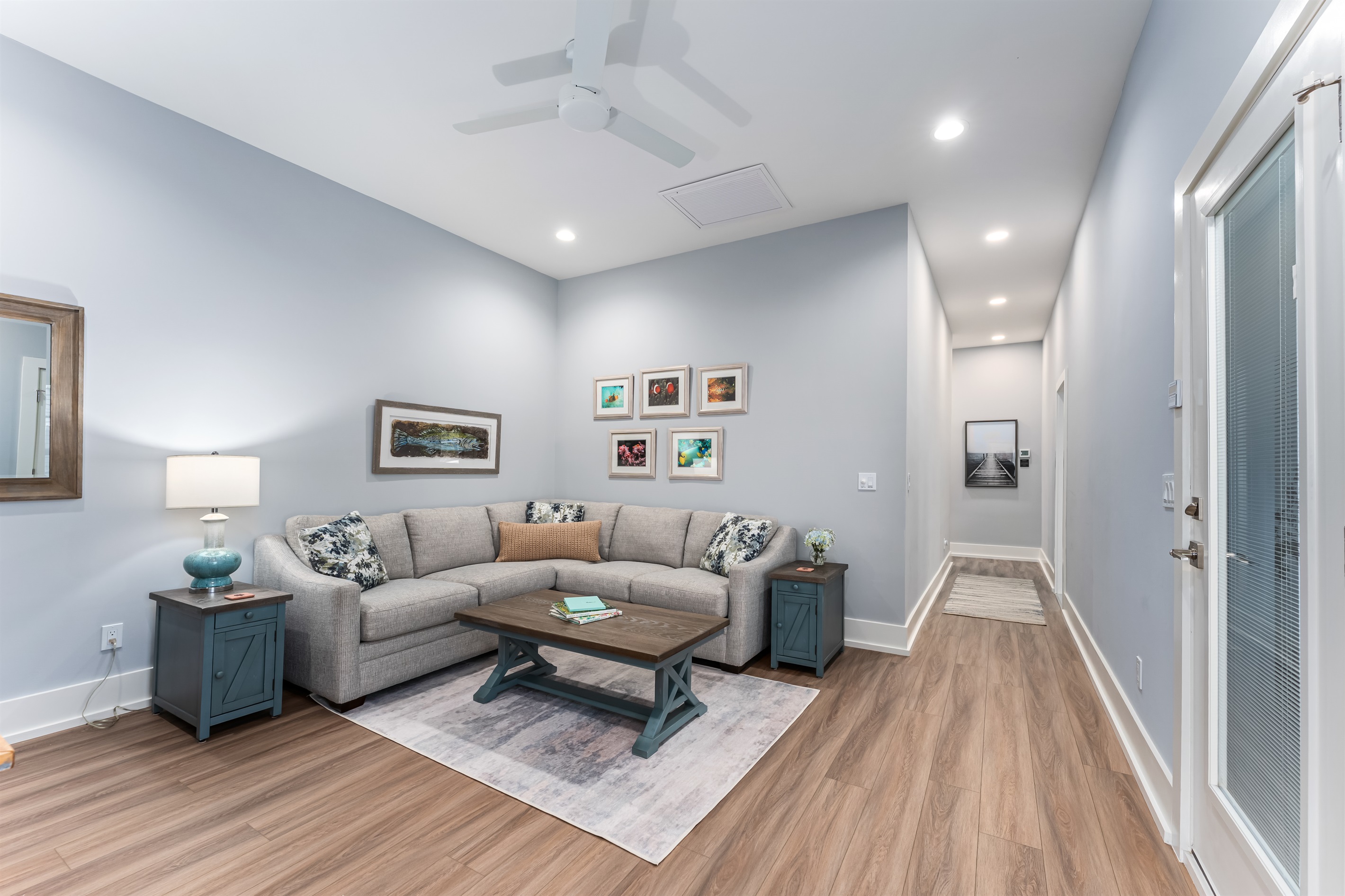 Upstairs, the main floor acts as the heart of this home, where soft blues and sandy beiges come alive under streams of natural light, framed by breathtaking coastal views. Sink into the L-shaped sectional in the cozy living room to plan the day's itinerary or enjoy a family movie night on the large TV.